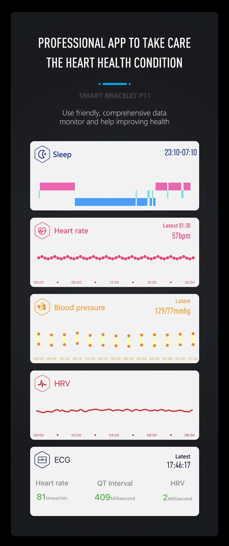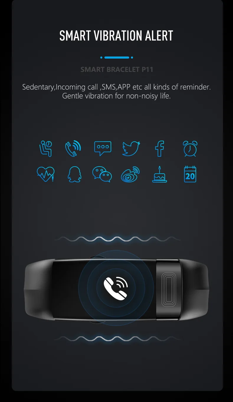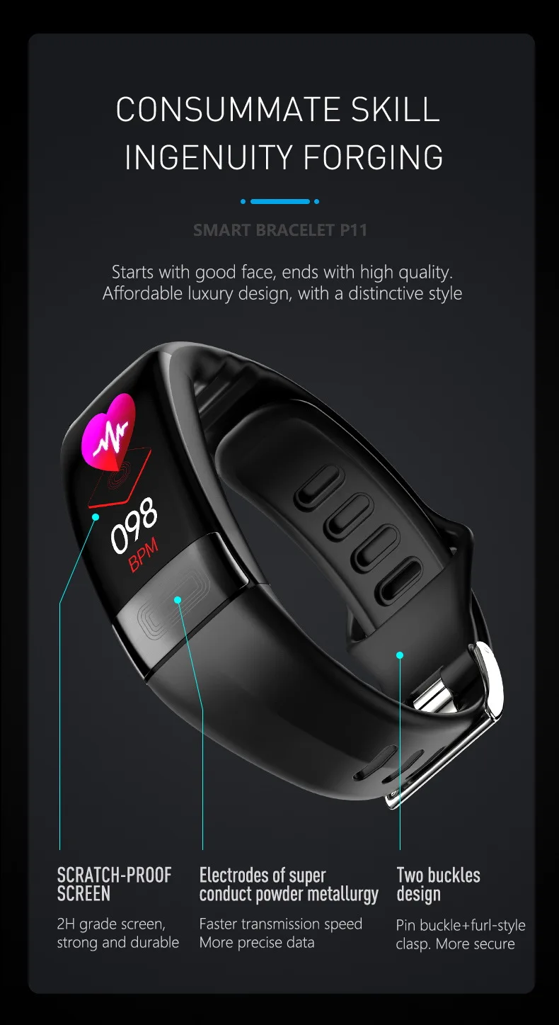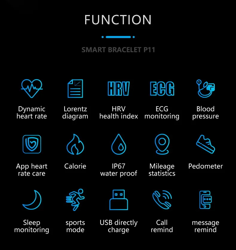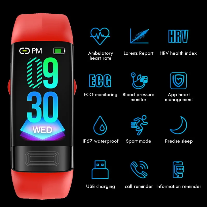 1, сверхпроводящие материалы электрода порошковой металлургии, скрининг 32 заболеваний электрокардиограммы2, Водонепроницаемый со стандартным дизайном IP67 с тройной защитой машина, расширенный электрод сенсорный 2-в-1 технологии3, интеллектуальное бесшумное вибрационное напоминание, удобная зарядка USB типа plug-in4, несколько спортивных режимов5,24 часовой мониторинг сердечного ритмаОсновной способ подключения смарт-браслета:Шаг 1: Включите Bluetooth мобильный телефон.Шаг 2: сканирование qr-кода в руководстве пользователя для загрузки приложенияШаг 3: Включите Bluetooth, откройте загруженное приложение, найдите браслет в приложении и подключите устройство.Основные функции: скрининг 32 заболеваний ЭКГОсновные функции: подсчет шагов, калории для физических упражнений, обмен здоровьем (осуществляется через приложение, отправляется в WeChat Moments), настройка цели упражнений, обнаружение сердечного ритма в реальном времени, обнаружение артериального давления в реальном времени, мониторинг кислорода в крови. Напоминание о сне, напоминание о сидячем положении, напоминание о будильнике. Многофункциональный спортивный режим. Чип низкой мощности, здоровый стиль упражнений, можно подключить мобильные телефоны IOS и Android для обмена пакетами данных о здоровье, IP67 водонепроницаемый стандартный дизайн трех-изоляционной машины. Различные варианты режима ожидания. Специальный Пользовательский интерфейс sports UI.Параметры:Материал корпуса: цинковый сплавМатериал корпуса: поликарбонат + Порошковая МеталлургияМатериал ремешка: импортный ремень из ПТПЦвет: черный, красный, синийПроцессор: скандинавский 52832ОЗУ: 64 КбROM: 256кбЖК-экран: 0,96 "дюймовый TFT HD цветной экран 80 * 160dbiЕмкость батареи: полимерный аккумулятор, 130 мАч в течение 6 дней, в режиме ожидания 10 дней (измеряется)Сенсорный экран: одноточечное сенсорное управление пружинной иглойВибрационный двигатель: Бесшумная вибрацияДатчик сердечного ритма: EL PD70Bluetooth: BT4.0Датчик поворачивания экрана: 3-осевой зондированияЗарядка: 2,0 USBЯзыки поддержки приложения: китайский, традиционный китайский, английский, японский, корейский, немецкий, русский, испанский, итальянский, французский, вьетнамский, португальский, персидский (Арабский) 13 языковРазмер внешнего вида (приблизительно): длина ремешка 225 мм/8,86 ''* длина 43 мм/1,69'' * ширина корпуса 20 мм/0,79''Вес нетто голого металла: около 0,026 кг