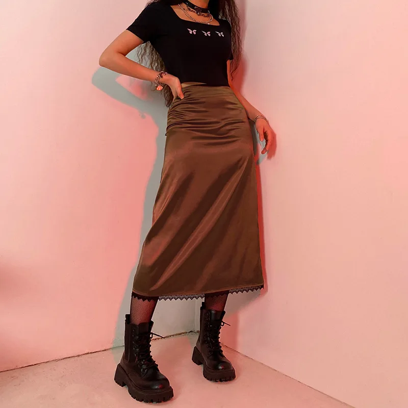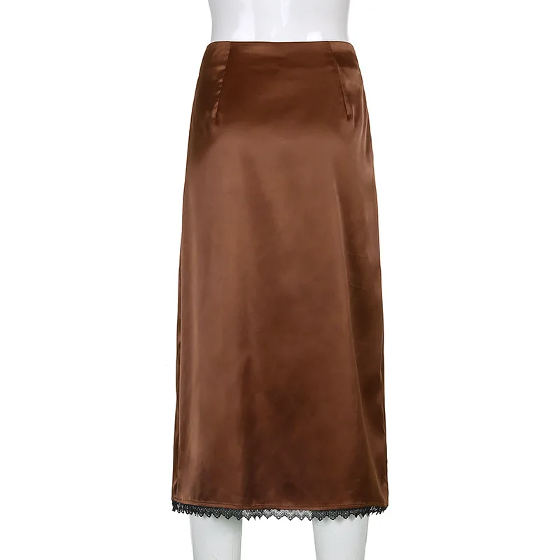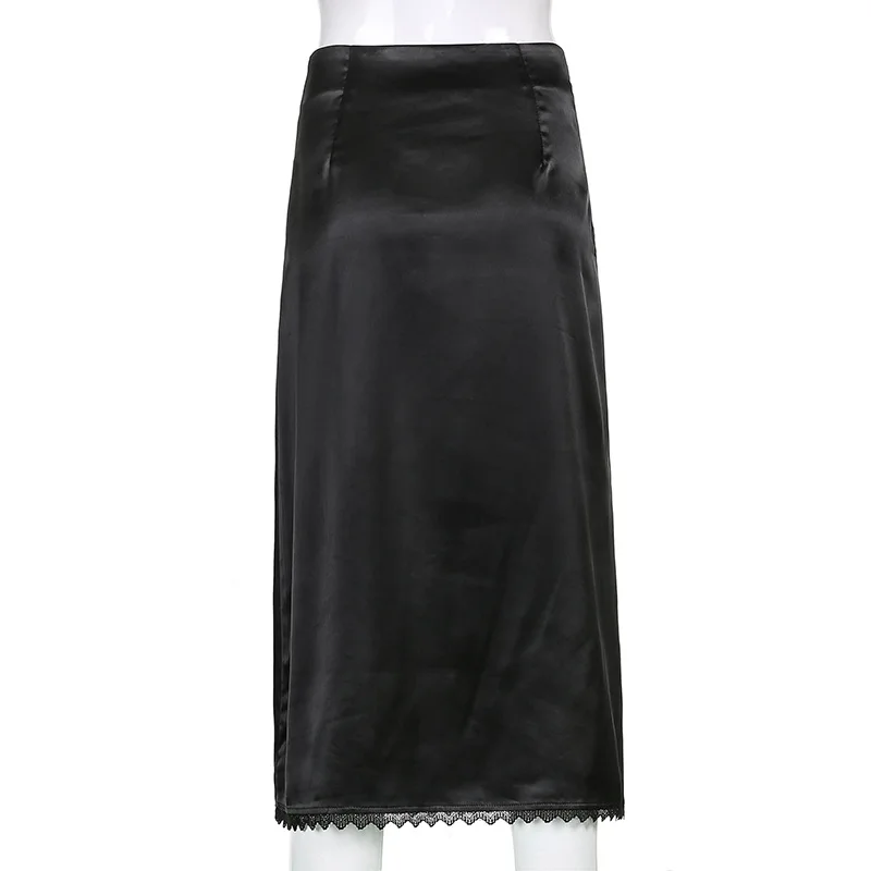Женская атласная длинная юбка, однотонная винтажная кружевная пряма...
