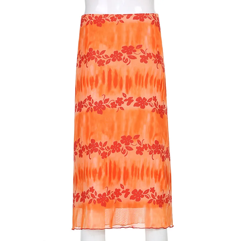 Оранжевая юбка миди с цветочным принтом, эластичная сетчатая юбка д...