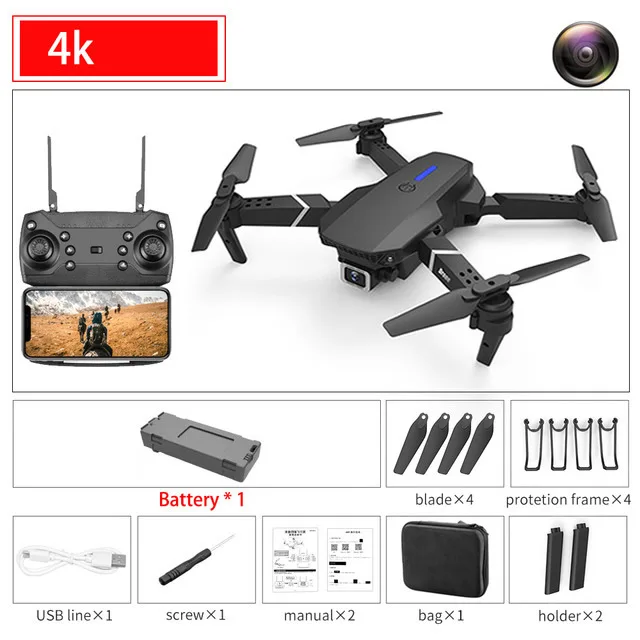 1 * E88 RC Квадрокоптер1 * передатчик1*3,7 V 1800mAh Lipo батарея1 * USB кабель для зарядки4 * защитный чехол4 * Запасные вентиляторы