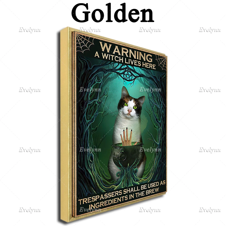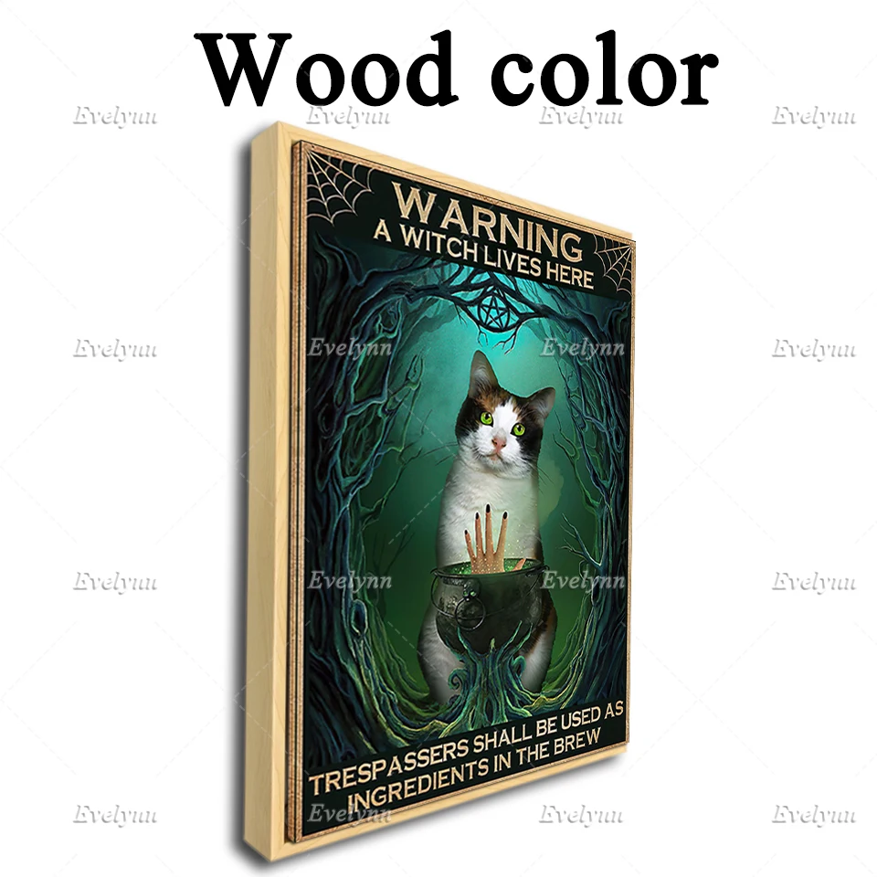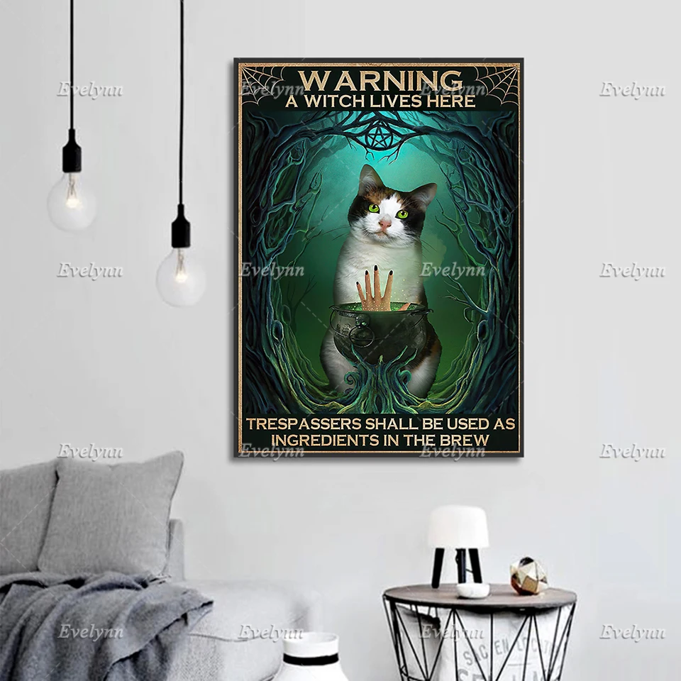 Ретро-постер ведьмы живет здесь пятнистый Котчерная кошка на День всех святых Швейные настенные художественные принты домашний декор холст плавающая рамка