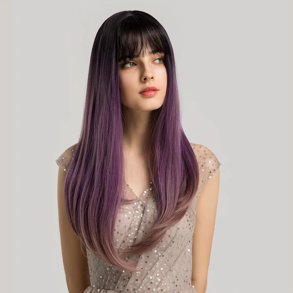 Длинные прямые черные фиолетовые синтетические парики с эффектом омбре GEMMA с челкой для женщин и девушек, парики для косплея и вечеринки в стиле "Лолита", термостойкие парики