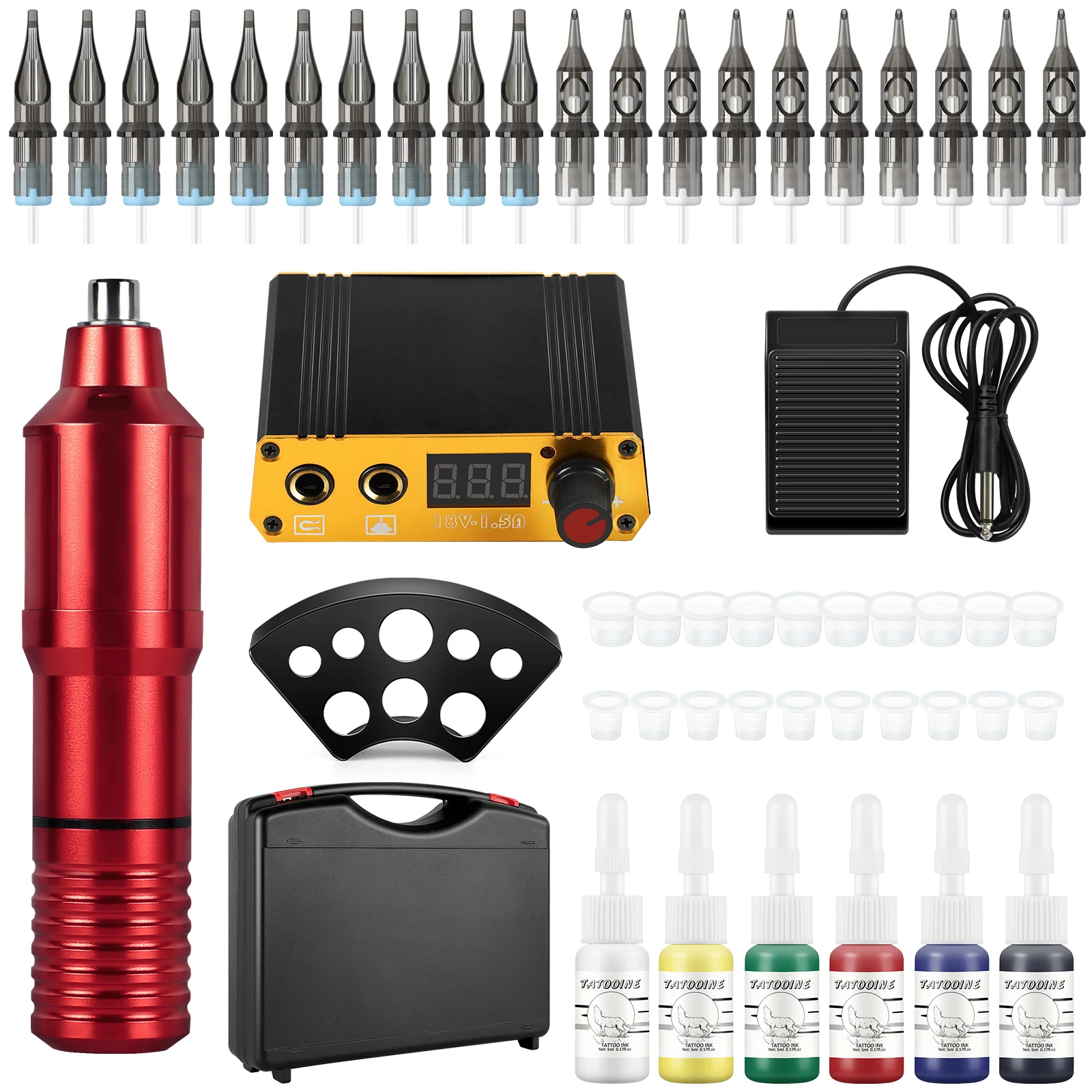 Мини питание Supplyx1Педализатор для ног x1Тату Machinex120 шт./кор. татуировки Needlesx16 шт. тату чернила x1Татуировка Cuos чернила Holderx1Маленькие чернила для тату Cupsx10Большие чернила для тату Cupsx10Коробка для тату x1