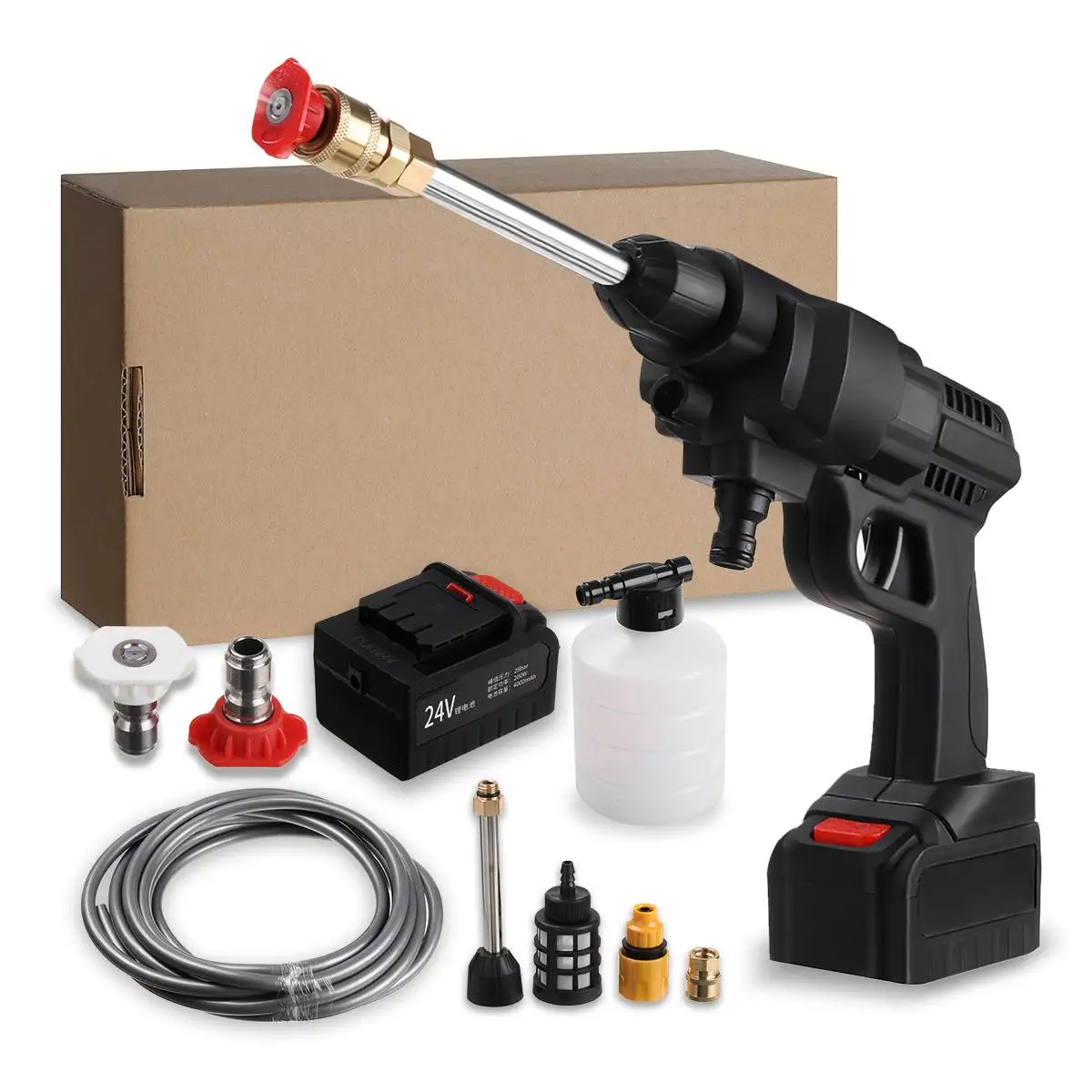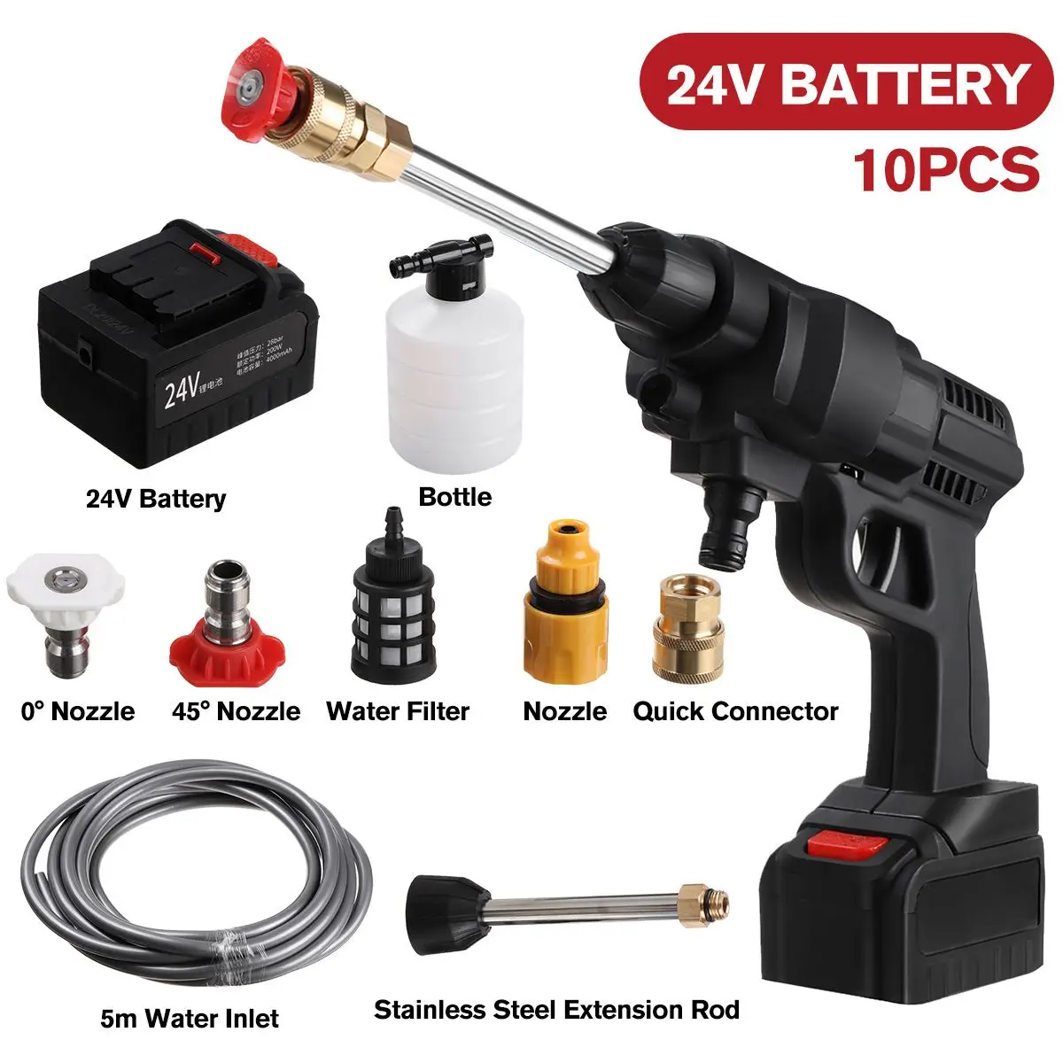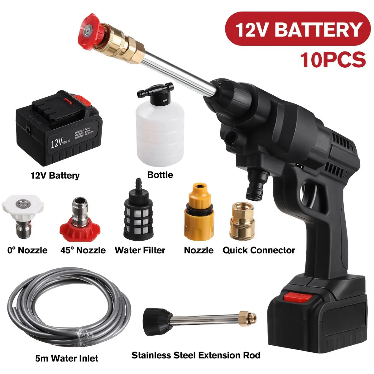 Посылка включает в себя:1x Автомобильный распылитель воды высокого давления1 х 5 м вход для воды1x адаптер питания1 бутылка1x Удлинительный стержень из нержавеющей стали1x 0 ° выход воды1x быстрый разъем1x 40 ° выход воды1x аккумулятор
