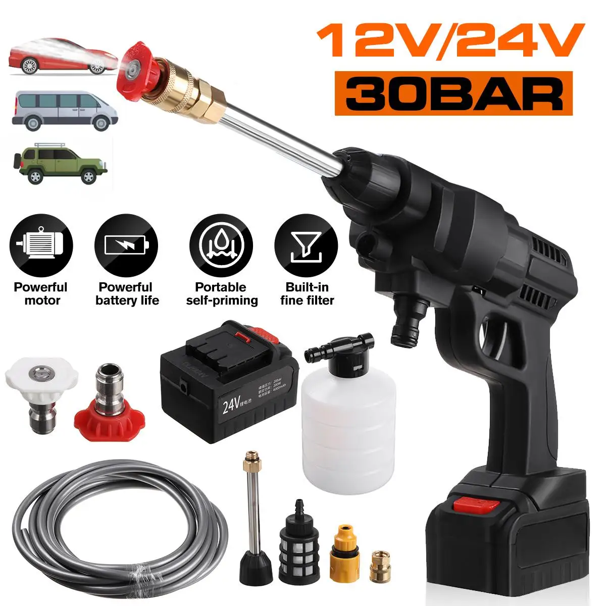 Характеристики:-Материал: АБС + нержавеющая сталь-Цвет: черный-Мощность: 156 Вт (12 В), 240 Вт (24 В)-Напряжение: 12 В, 24 В-Срок службы батареи: 60 минут-Пиковое давление: 30 бар-Длина выходной трубы: 5 метров