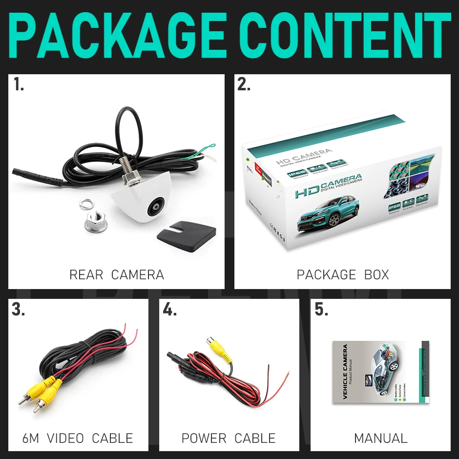 1. Камера заднего вида (вертикальная установка)2 посылка вочная коробка3. Видеокабель 6 м4. Кабель питания5. Руководство пользователя