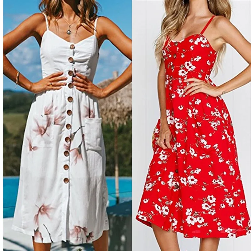Женское пляжное платье миди с цветочным принтом, красное, белое, черное платье на пуговицах с открытой спиной и V-образным вырезом, на лето, 2022