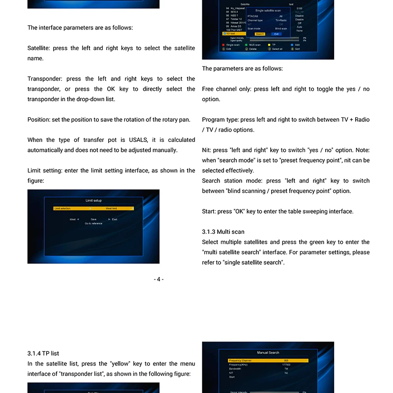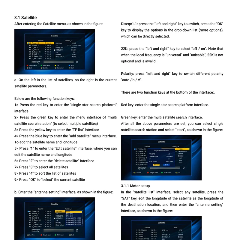 3,1 спутникПосле входа в меню «Спутник», как показано на рисунке:A. Слева находится список сателлитов, справа-токПараметры спутника.Ниже приведены следующие функциональные клавиши:1> нажмите красную клавишу, чтобы войти в «платформу поиска Одной звезды»Интерфейс2> Нажмите Зеленую клавишу, чтобы войти в меню «multiСпутниковая поисковая станция "(для выбора нескольких сателлитов)3> нажмите желтую клавишу, чтобы войти в интерфейс "TP list"4> нажмите синюю клавишу, чтобы войти в меню «Добавить спутник».Чтобы добавить название и долготу спутника5> нажмите «1», чтобы войти в интерфейс «Edit satellite», где вы можетеОтредактируйте название и долготу спутника6> нажмите «2», чтобы войти в интерфейс «удалить спутник»7> нажмите «3», чтобы выбрать все спутники8> нажмите «4», чтобы сортировать список сателлитов9> нажмите «ок», чтобы «выбрать» текущий спутникB. Введите интерфейс «Настройка антенны», как показано на рисунке:Параметры следующие:Локальный осциллятор: Нажмите кнопку OK, чтобы выбрать параметр вВыпадающий список напрямую.Транспондер: нажмите кнопку «влево и вправо», чтобы выбратьТранспондер и нажмите кнопку «OK», чтобы выбрать транспондер вВыпадающий список.Diseqc1.0: нажмите «влево и вправо» для переключения, нажмите «OK» для отображенияОпции в выпадающем списке (отключить, порт 1, порт 2, порт 3,Порт 4) который может быть выбран непосредственно.Diseqc1.1: нажмите кнопку «влево и вправо» для переключения, нажмите кнопку «OK»Ключ для отображения параметров в выпадающем списке (больше опций),Который может быть выбран непосредственно.22K: нажмите кнопку «влево и вправо», чтобы выбрать «off / on». Обратите внимание, чтоКогда локальная частота «универсальна» и «однородна», 22K не являетсяЯвляется необязательным и недействительным.Полярность: нажмите кнопку «влево и вправо» для переключения разной полярности"Авто/ч/в".В нижней части интерфейса есть две функциональные клавиши:.Красный ключ: Введите интерфейс платформы поиска Одной звезды.Зеленый ключ: Введите интерфейс многоспутникового поиска.После установки всех вышеуказанных параметров вы можете выбрать одинСпутниковая поисковая станция и выберите «СТАРТ», как показано на рисунке: