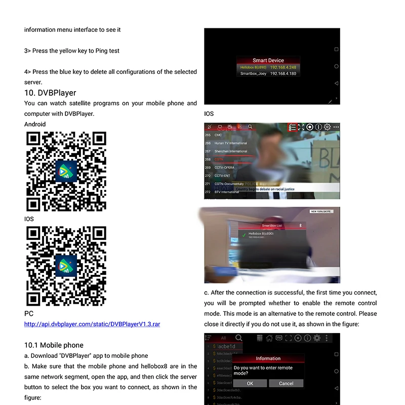 Вы можете смотреть спутниковые программы на свой мобильный телефон иКомпьютер с DVBPlayerAndroid/IOS: используйте мобильный телефон для сканирования qr-кода коробки, загрузки и установки приложения DVBPLAYER или поиска DVBPLAYER в app StoreПК: http://api.dvbplayer.com/static/DVBPlayerV1.3.rarМобильный телефонА. Загрузите приложение «DVBPlayer» на мобильный телефонБ. Б. Убедитесь, что мобильный телефон и hellobox8Тот же сегмент сети, откройте приложение, а затем нажмите на серверКнопка для выбора коробки, которую вы хотите подключить, как показано наРисунок:Android/IOSC. c. После успешного подключения, при первом подключении,Вам будет предложено включить пульт дистанционного управленияРежим. Этот режим является альтернативой пульту дистанционного управления. Пожалуйста,Закройте его напрямую, если вы не используете его, как показано на рисунке:D. После выхода из режима дистанционного управления мобильный телефон можетСмотрите программу на коробке, как показано на рисунке:AndroidE. На мобильный телефон, вы также можете выполнить рядОперации на hellobox 8, такие как программа поиска, программа редактирования,Записывайте программы, делитесь программой и другими функциями.Основные функции заключаются в следующем:1) Запись программы непосредственно на мобильный телефон.2) введите установку меню, вы можете отсканировать один или несколькоСпутники, редактировать спутники и TP.