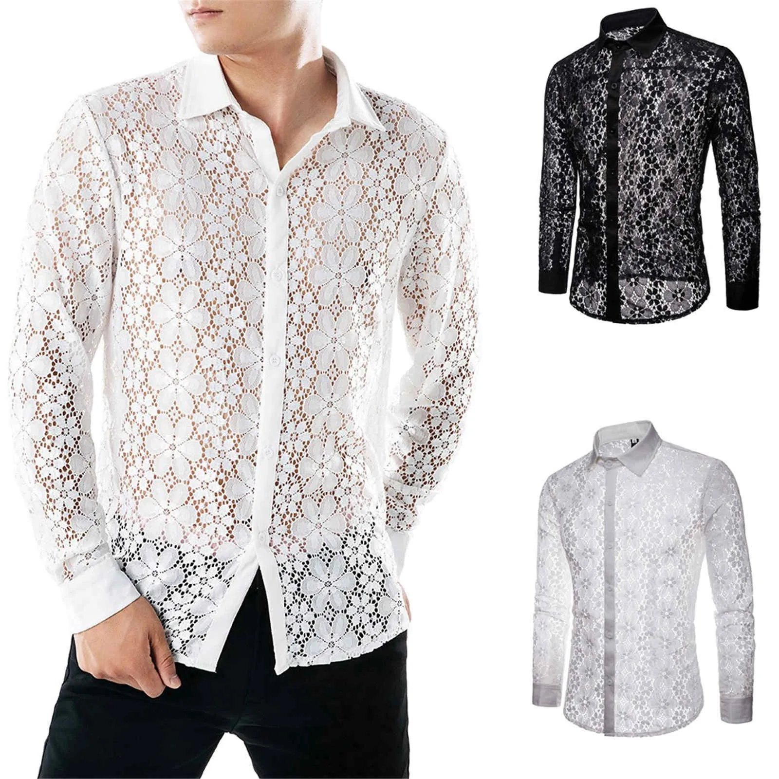 Рубашка мужская прозрачная однотонная с длинным рукавом, модная Клубная сорочка с отложным воротником и длинными кружевными рукавами вечерние кантная вечерняя одежда