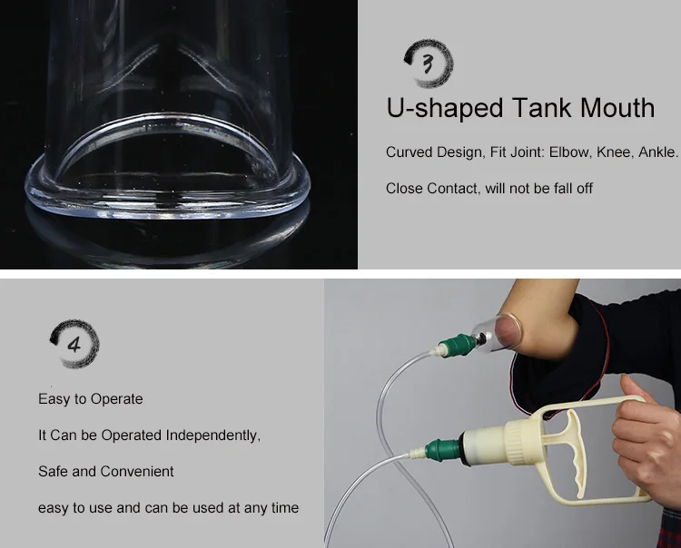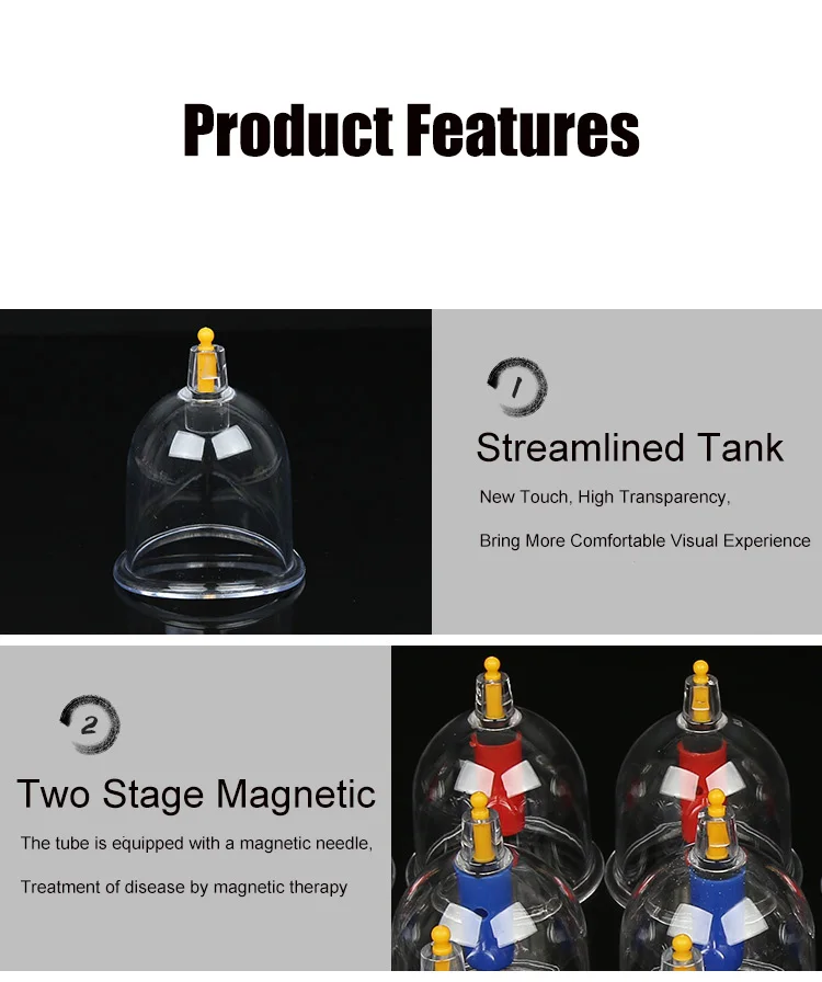 1. Привлекательный дизайн и прочный, прочный и ударопрочный материал.2. Прозрачный корпус: легко регулировать внутреннее давление, и внутренняя обработка может быть четко видна.3. Безопасное и хорошее уплотнение: Гладкий край дуговой чашки увеличивает площадь, соединяющую с кожей, что подтверждает лучшее уплотнение.4. 7 размер чашки подходит для всех частей тела.5. Простота в эксплуатации: огонь и электричество не требуются, безопасны и надежны, просты в эксплуатации.
