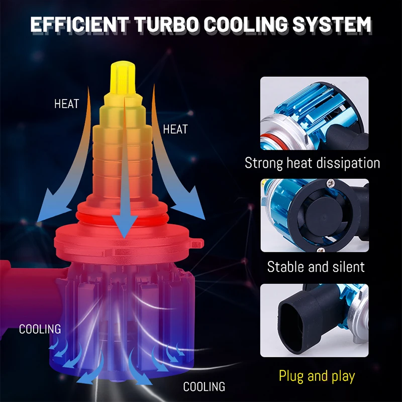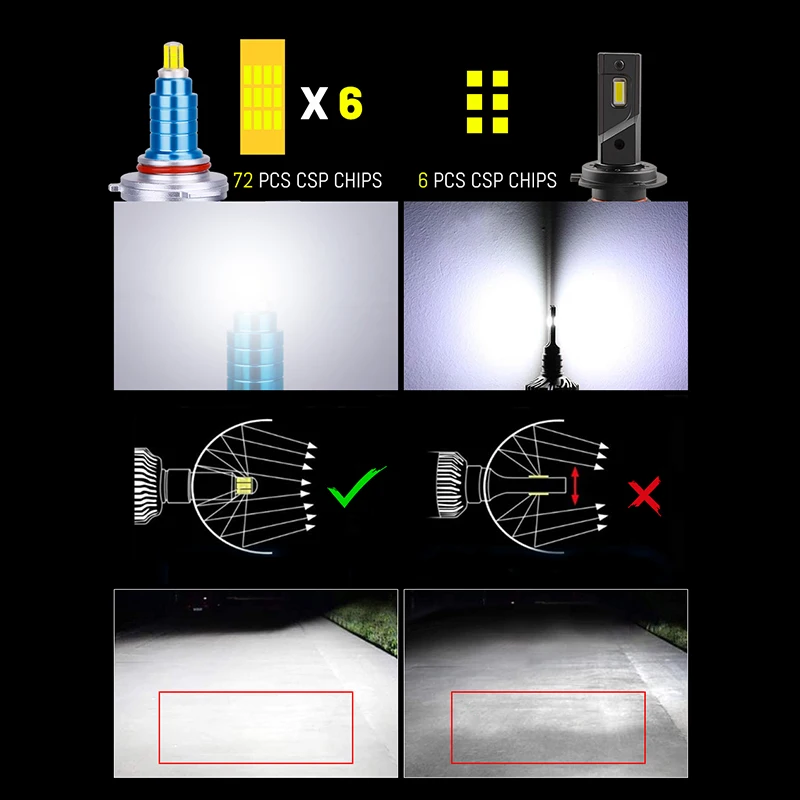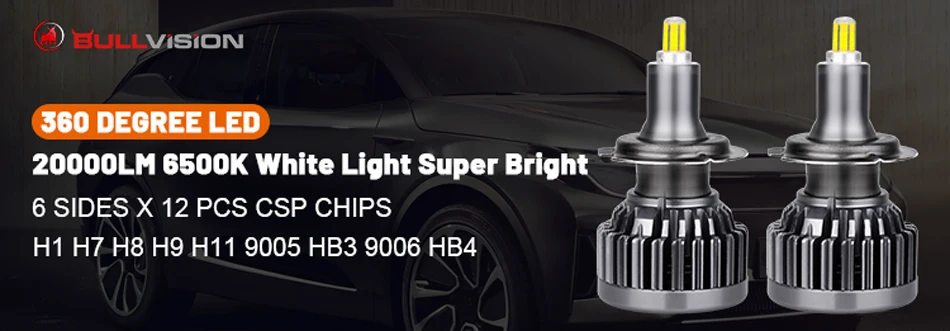 (1) светодиодная фара 20000LM/пара, каждая лампа 10000lm, супер яркая.(2) один светильник имеет 6 сторон 72 шт CSP чипы, 360 градусов светильник ing.(3) Этот продукт 6500k, чисто белый светильник.(4) Мощность этого продукта составляет 60 Вт/пара, каждая лампа 30 Вт.