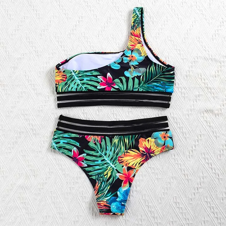 Купальник-бикини пуш-ап на одно плечо с принтом листьев и высокой т...