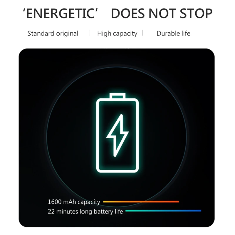 Легко заряжать: прилагается USB-зарядка, оснащен внешним аккумулятором емкостью 1600 мАч и USB-зарядным кабелем, легко заряжать и работать.