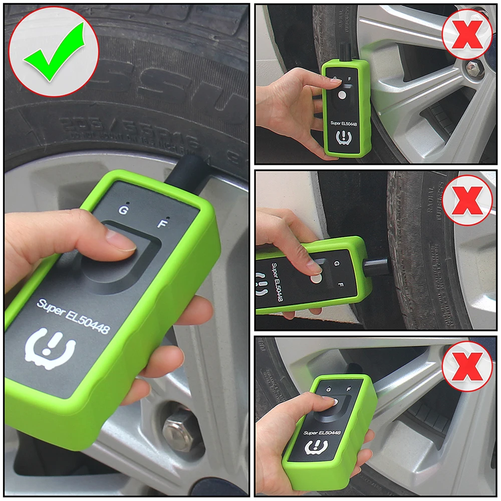 1. Для работы требуется 1 шт. аккумулятор 9 В (не входит в комплект поставки)2. Установите автомобиль в режиме обучения TPMS. (автомобильные рожки дважды)3. Начиная с левой передней шины, антенна специального инструмента для контроля давления в шинах находится вверх по боковой стенке шины возле обода стержня клапана, чтобы запустить антенну. Нажмите и отпустите кнопку и подождите, пока динамик начнет чикать. После chirping динамика, информация датчика считывается и сигнал поворота, который будет считываться в следующем положении будет светильник.4. Выполните этот заказ для отдыха TPMS один за другим: передний левый, передний правый, задний правый, задний левый.5. После того, как все датчики восстановились, рога автомобиля дважды, TPMS повторно учатся.