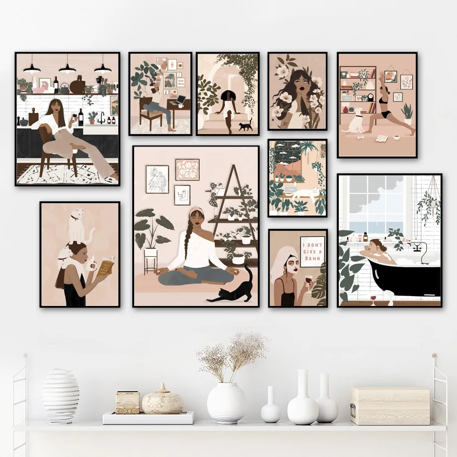 Абстрактная Мода Девушка Йога отдых читать пить Купание скандинавский Плакат стены искусства принты Холст Живопись Декор картины для гостиной