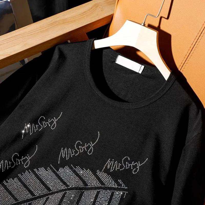 Женская футболка со стразами, черная футболка с коротким рукавом, со стразами, большого размера, лето 2021