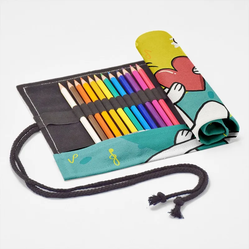 Холщовый чехол для карандашей унисекс, с изображением мультяшного кота, 24 Отверстия, для хранения, ручка для девочек