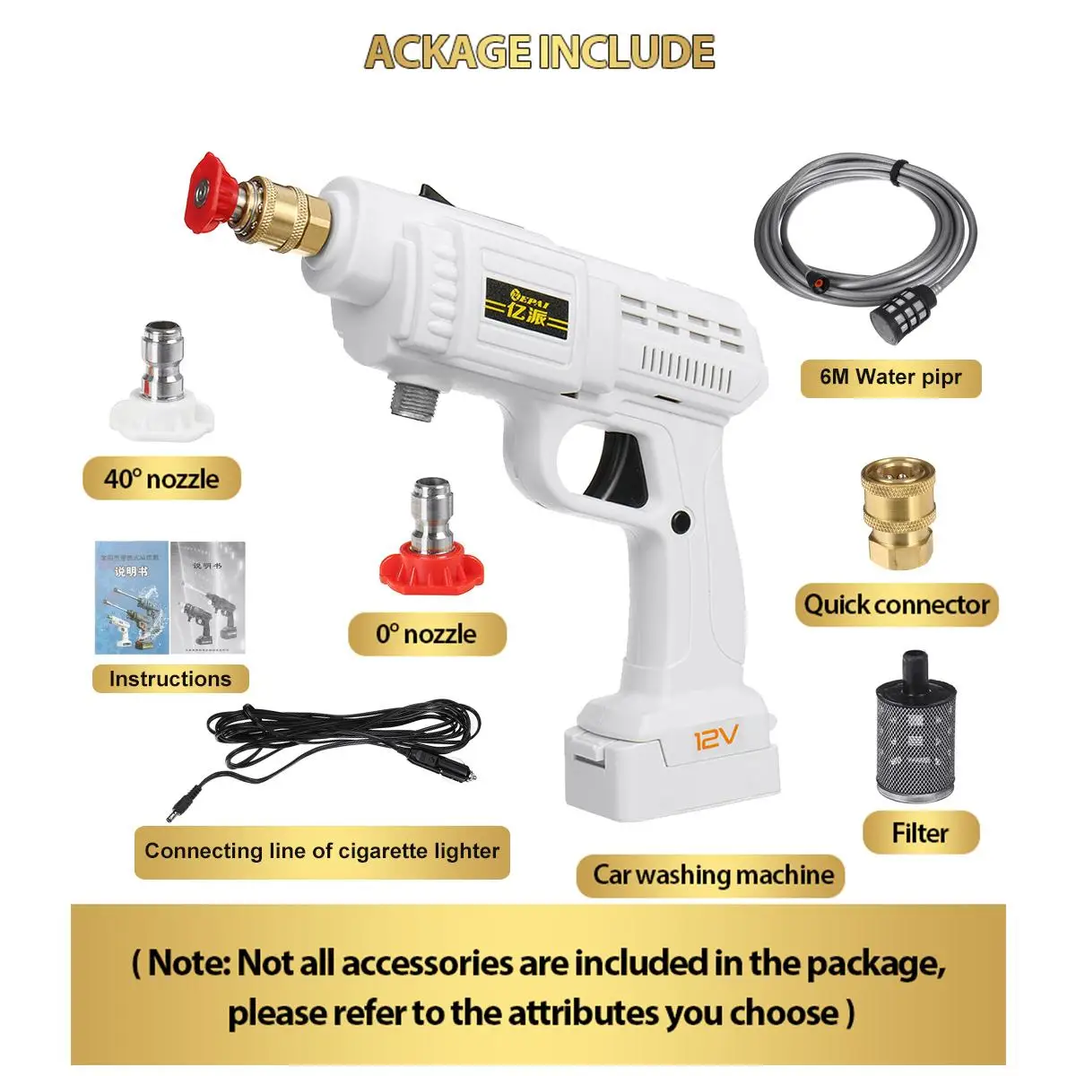 Посылка включает в себя:1 x Автомобильная стиральная машина1 x быстрый разъем1 х 6 м Водопровод1x6m кабель для прикуривателя1 x сопло 0 °1 x сопло 40 °Соединительная линия для прикуривателя-1 шт.1 x Руководство по введению