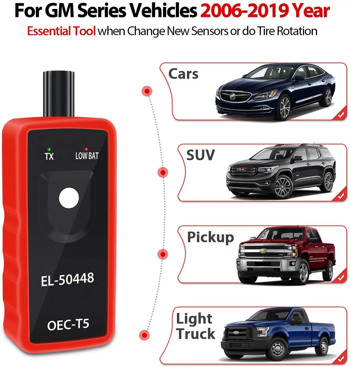 EL50448 работает на большинстве двигателей общего назначения (Buick, Cadillac, Chevrolet, GMC), произведенных на Североамериканском рынке. Не сработает, если вы приобрели датчики вторичного рынка с неправильной частотой. EL50448 подходит для большинства автомобилей GM, оснащенных системой контроля давления в шинах (TPM) 315 или 433 МГц. Эту процедуру повторного обучения можно выполнить с помощью специального устройства EL-50448.