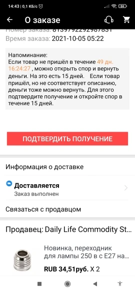 товар всё таки получил, но до Питера шло 2,5 месяца! и считаю крайне не корректным, когда цена выставляется одна в 35 рублей за 1 набор из 5 переходников,, который можно оценить действительно в 0,5$, а потом реальная цена оказывается порядка 1,2$. Если они отдельно включают оплату сравнимую с ценой товара, то доставка должна быть дней 10, а не 75-80 дней!