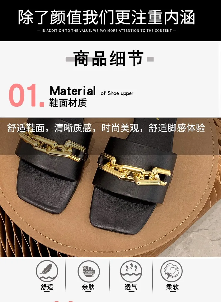 Сандалии женские кожаные с квадратным носком, тонкие повседневные шлепанцы с открытым носком, на плоской подошве, сланцы, пляжные шлепанцы с металлической цепочкой, 2021