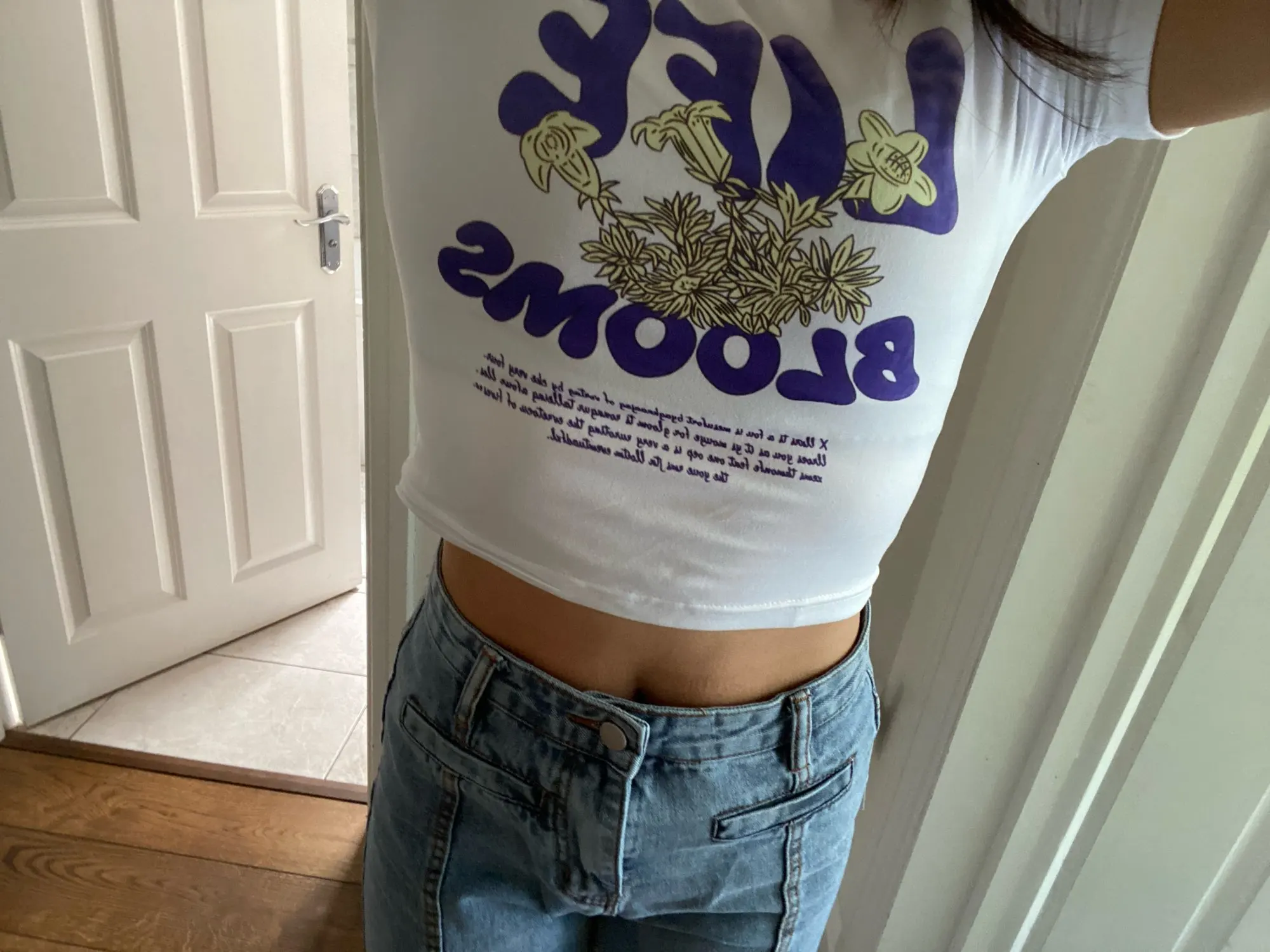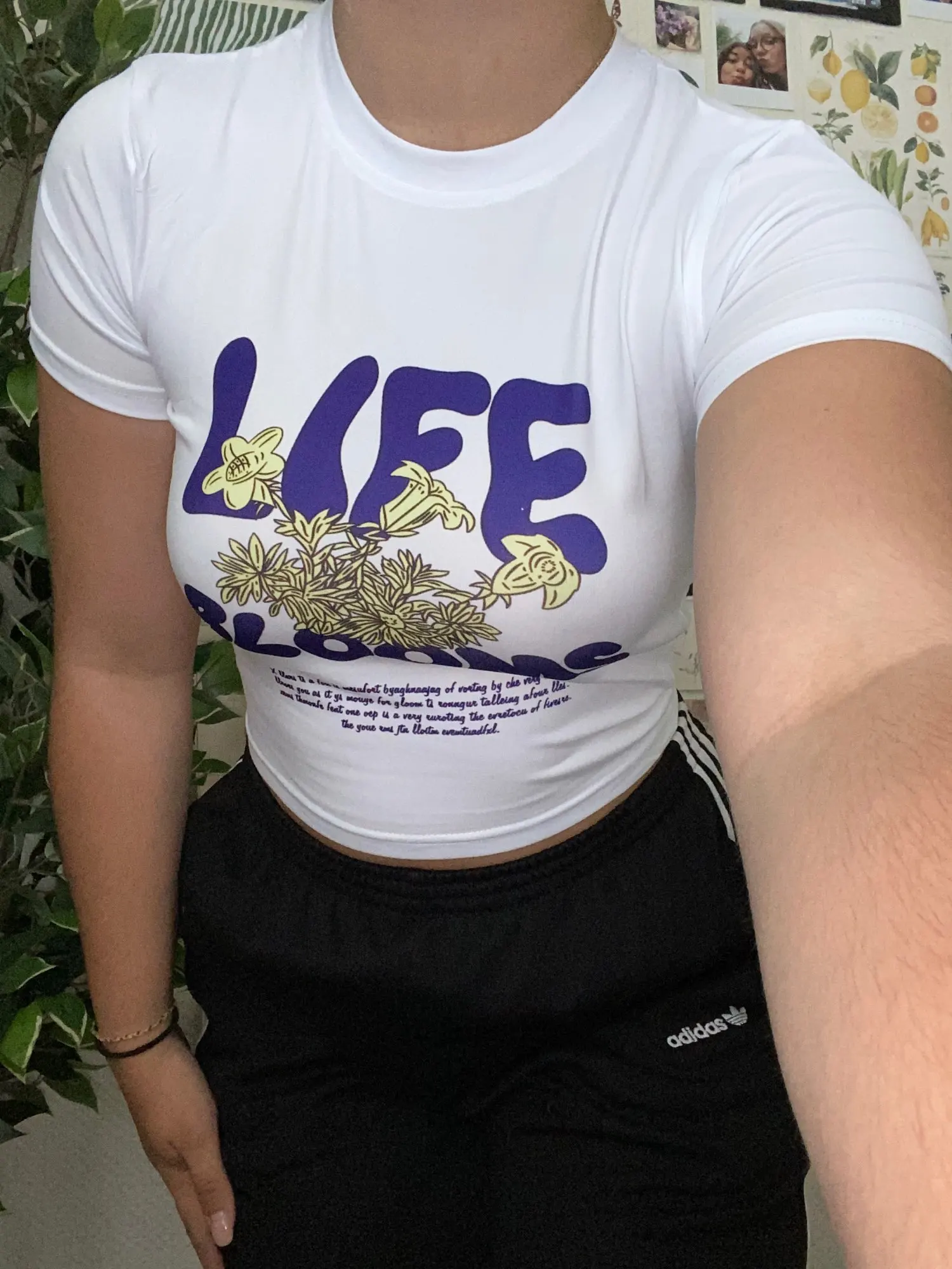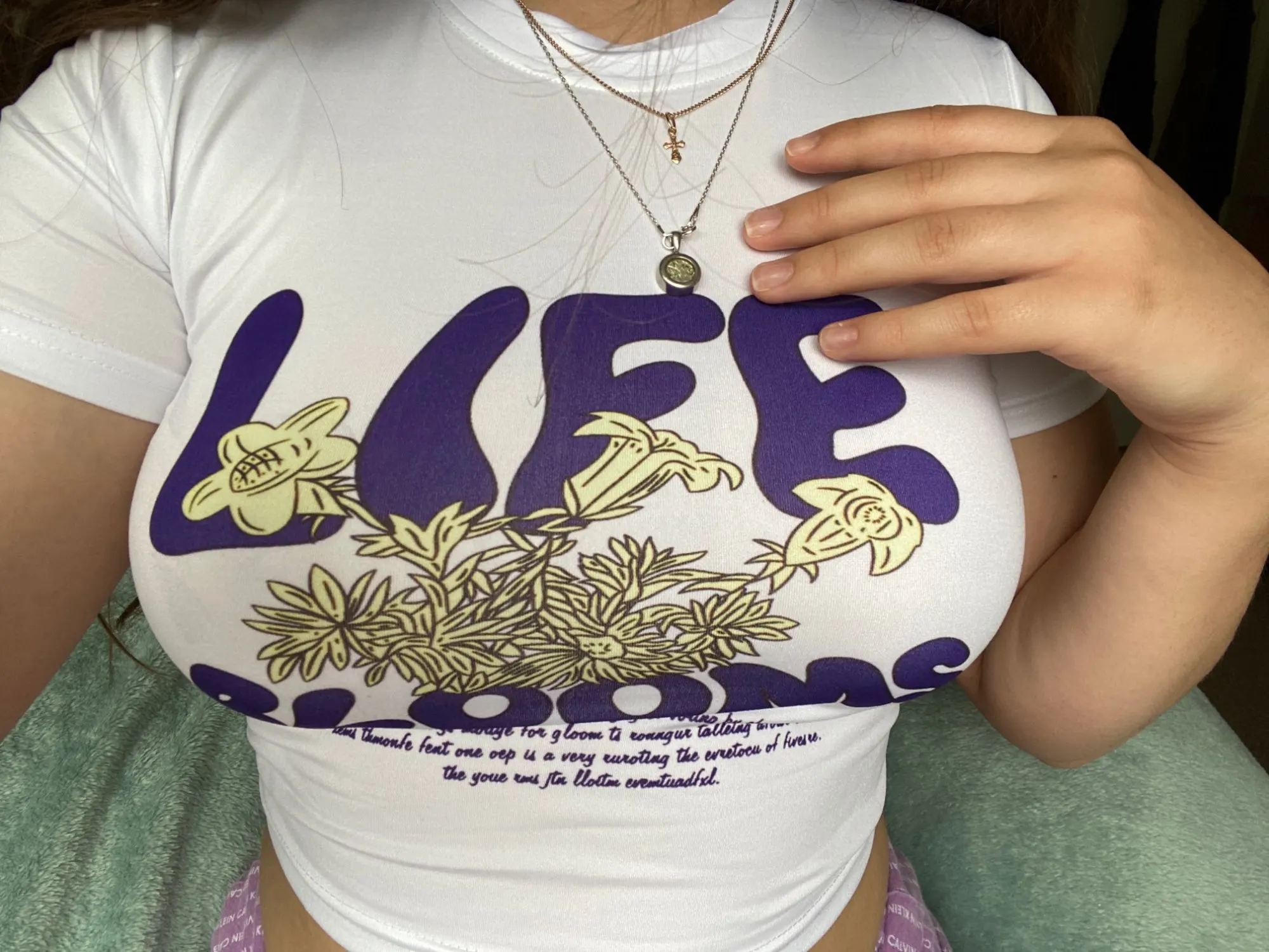 Я люблю это супер красиво!!! Надпись не синяя, а фиолетовая, и она довольно плотная, но мне все равно очень нравится, и она абсолютно не прозрачная, я ношу ее без бюстгальтера на фотографиях, это действительно хорошо, и это произошло на 2 недели раньше, чем ожидалось!
