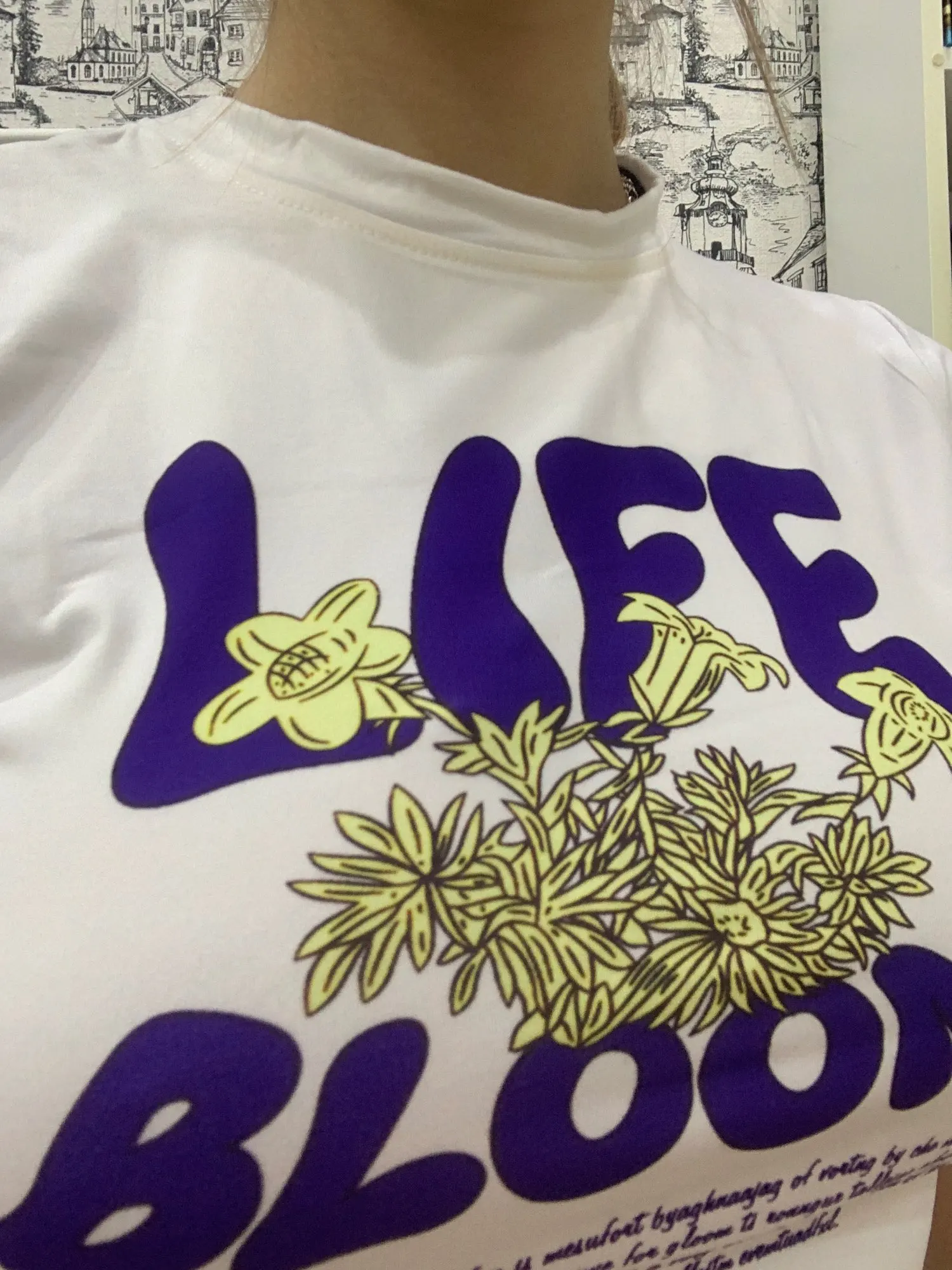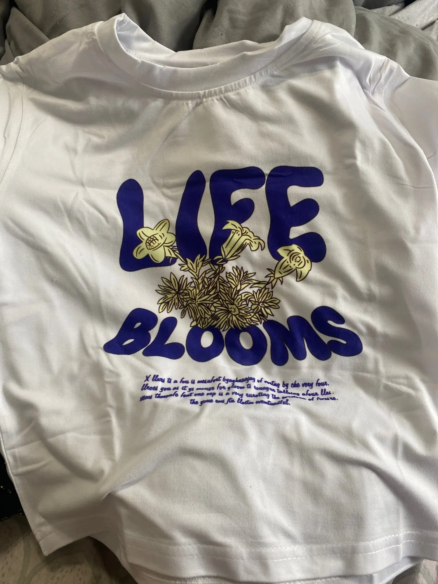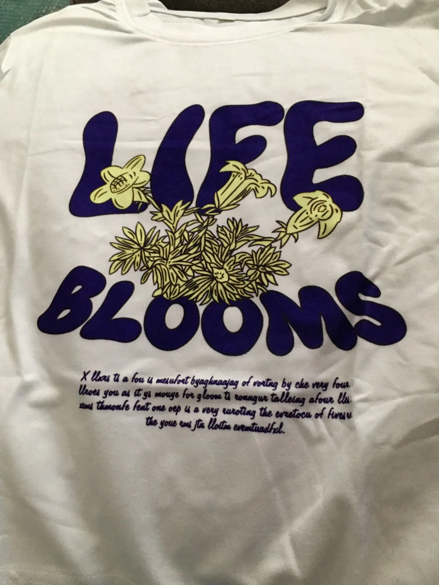 Синие буквы были фиолетовыми, а цветы были бледно-желтыми, а не яркими на картинке. Рубашка была бы лучше, если бы она была из хлопка, а не из полиэстера. Размер милый.