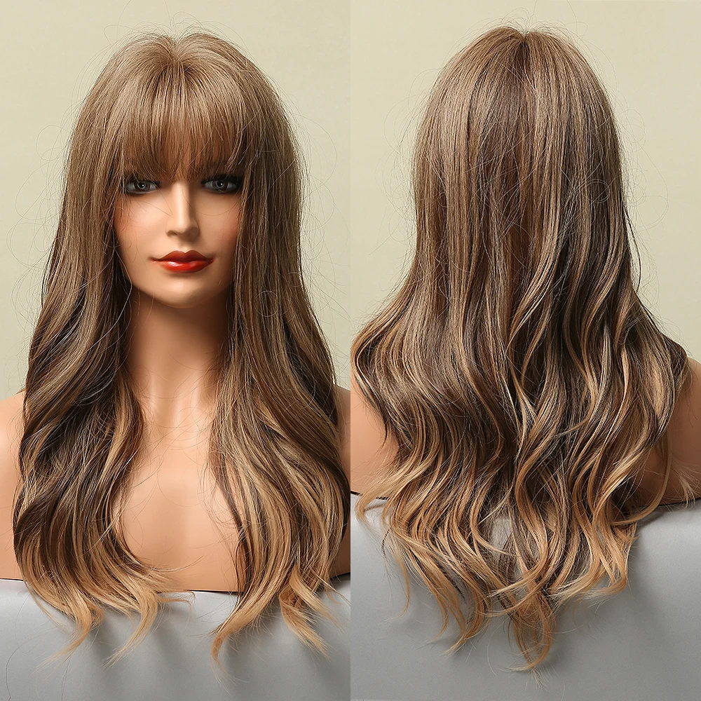Длинные Синтетические волнистые парики с челкой, Омбре, коричневый ...