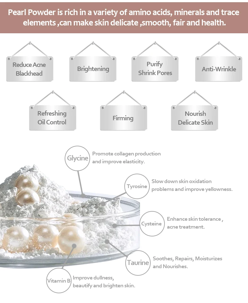 Название продукта: натуральный чистый жемчужный порошокВес нетто: 500 г/250 гПоддержка оптовых продаж по более выгодной цене.Эффективность жемчужного порошка:1. Отбеливание, питание, контроль жирности, удаление акне, удаление черных точек и уменьшение пятен.ОтбеливаниеИзвестно, что жемчуг обладает отбеливающим эффектом с давних времен. Современная наука обнаружила, что микроэлементы в жемчуге могут увеличить количество SOD и усилить его активность. Селен-основное вещество при изготовлении глутатиона пероксидазы. Этот фермент может очищать свободные радикалы так же, как SOD. Улучшают тонус кожи.2. Контроль маслаНатуральный Нано Жемчужный порошок. Нано Жемчужный порошок имеет очень мелкий размер частиц, поэтому он имеет большую площадь поверхности и хорошую адсорбционную способность, которая может адсорбировать излишки масла на нем. При этом он также оказывает вяжущее действие, которое может контролировать секрецию масла и сделать кожу сухой и чистой.3. Лечение акнеЖемчужная пудра очищает тепло и детоксицирует, очищает кожу, контролирует содержание масла, способствует регенерации и восстановлению поврежденных тканей.4. Удаление черных точекСекрет жемчужной пудры для удаления черных точек в том, что жемчужная пудра обладает хорошей способностью глубокого очищения пор и обладает очень сильной адсорбционной способностью, которая может "засосать" омертвевшую кожу и глубокие поры.5. Устранение веснушек"Сборник Материи медики" давно четко указал: "жемчуг, помимо темного и темного", большое количество микроэлементов, содержащихся в жемчужном порошке, способно эффективно предотвратить увеличение липидных пероксидов, тем самым эффективно удаляя три основных пятна.