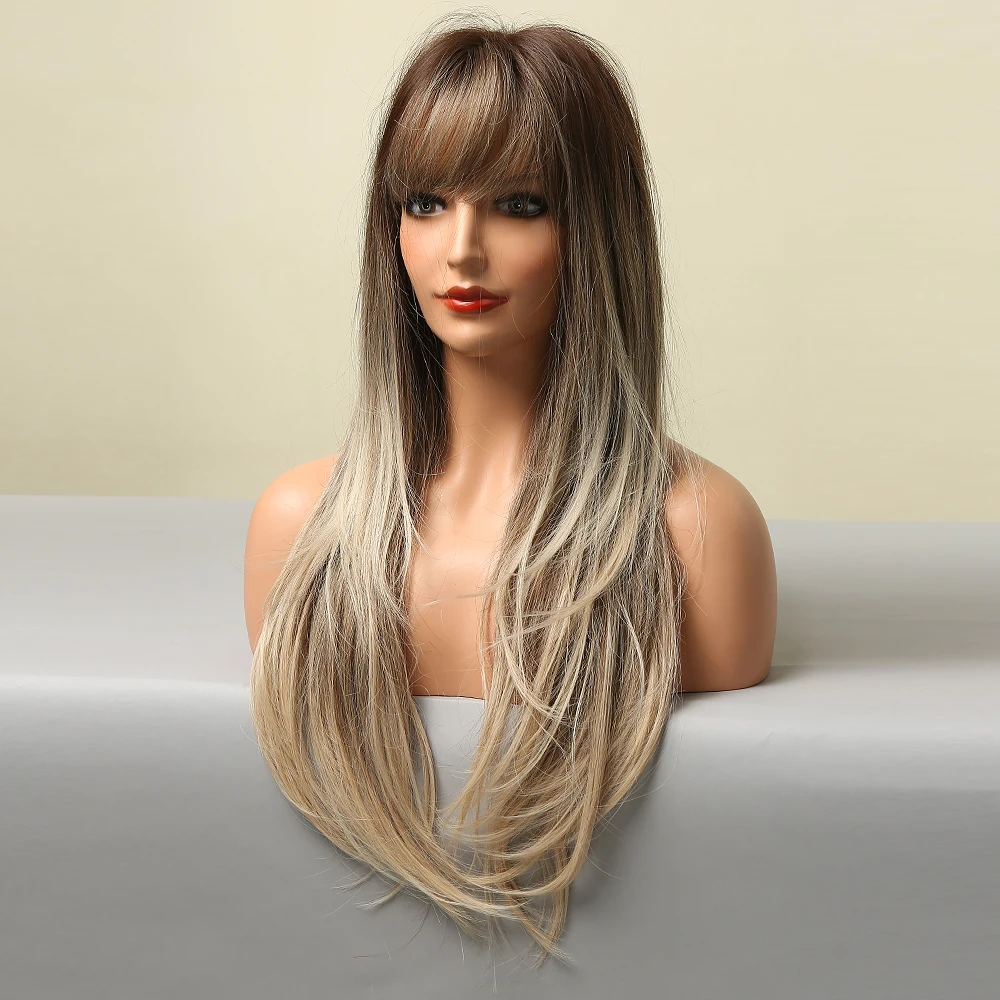 Длинные прямые синтетические парики с челкой, Омбре, пепепельно-кор...