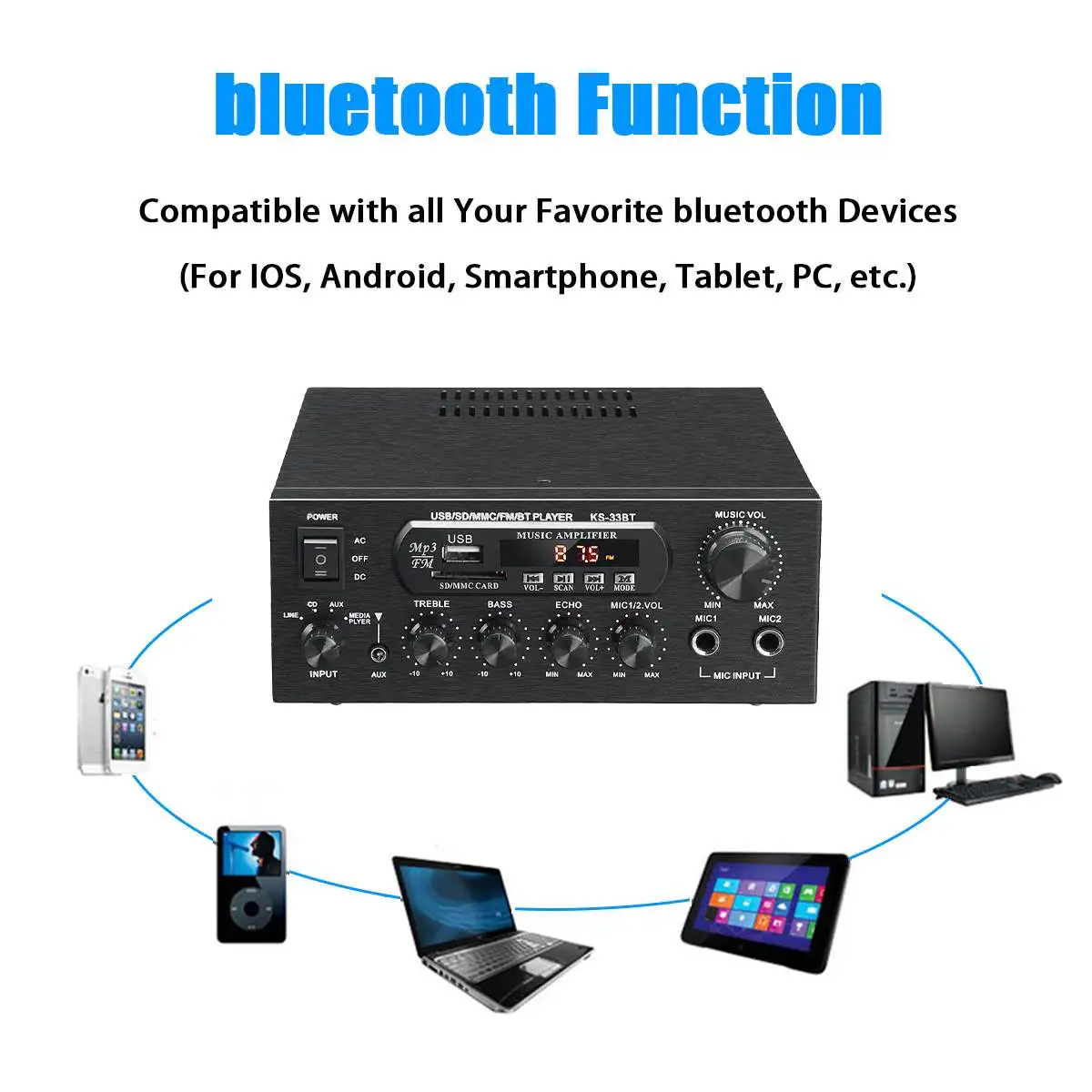 Особенности:-Цифровой mp3-плеер.-Интерфейс bluetooth для потоковой музыки от мобильный телефон-USB / SD слот для воспроизведения MP3 с флешки или карты памяти-Поддерживает FM стерео радио.-Поддержка 2-стороннего входа микрофона.-С высокими частотами, басами и регулятором громкости, очень прост в использовании.-Низкие искажения обеспечивают более четкий, мощный и мощный звук.-2-х канальный выход.-С функцией дистанционного управления.-Питание постоянного/переменного тока, подходит для домашнего использования.-Подходит для HiFi, систем домашнего кинотеатра и караоке