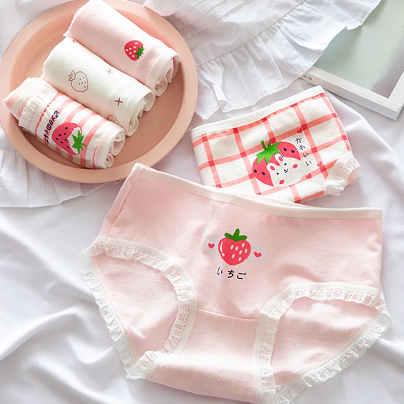Женские трусики из хлопка высокого качества, модные сексуальные кружевные женские трусы с клубничкой, дышащее нижнее белье со средней талией