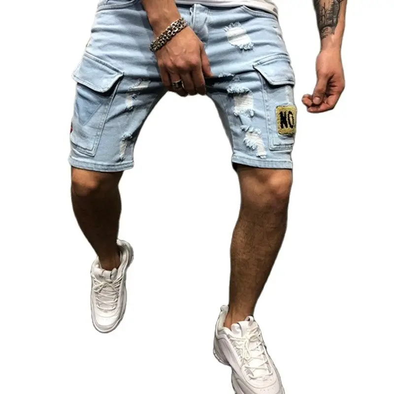 Шорты мужские рваные из денима, модные повседневные зауженные, эластичные, с значком и сломанными дырками, лето