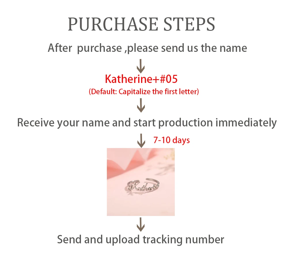 1. Пожалуйста, пришлите нам имя и шрифт, которые вы хотите заказать.2. Если вы не дадите нам имя и шрифт по индивидуальному заказу, мы свяжемся с вами. Если вы все еще не отвечаете через три дня, мы сделаем кольцо в соответствии с именем вашего получателя и отправим его.3. Вы не можете отменить ваш заказ в течение 12 часов, потому что мы уже начали производство и надеемся получить ваше понимание4. У нас есть собственная Производственная фабрика, если вам нужна оптовая или Прямая поставка, пожалуйста, свяжитесь с нами.