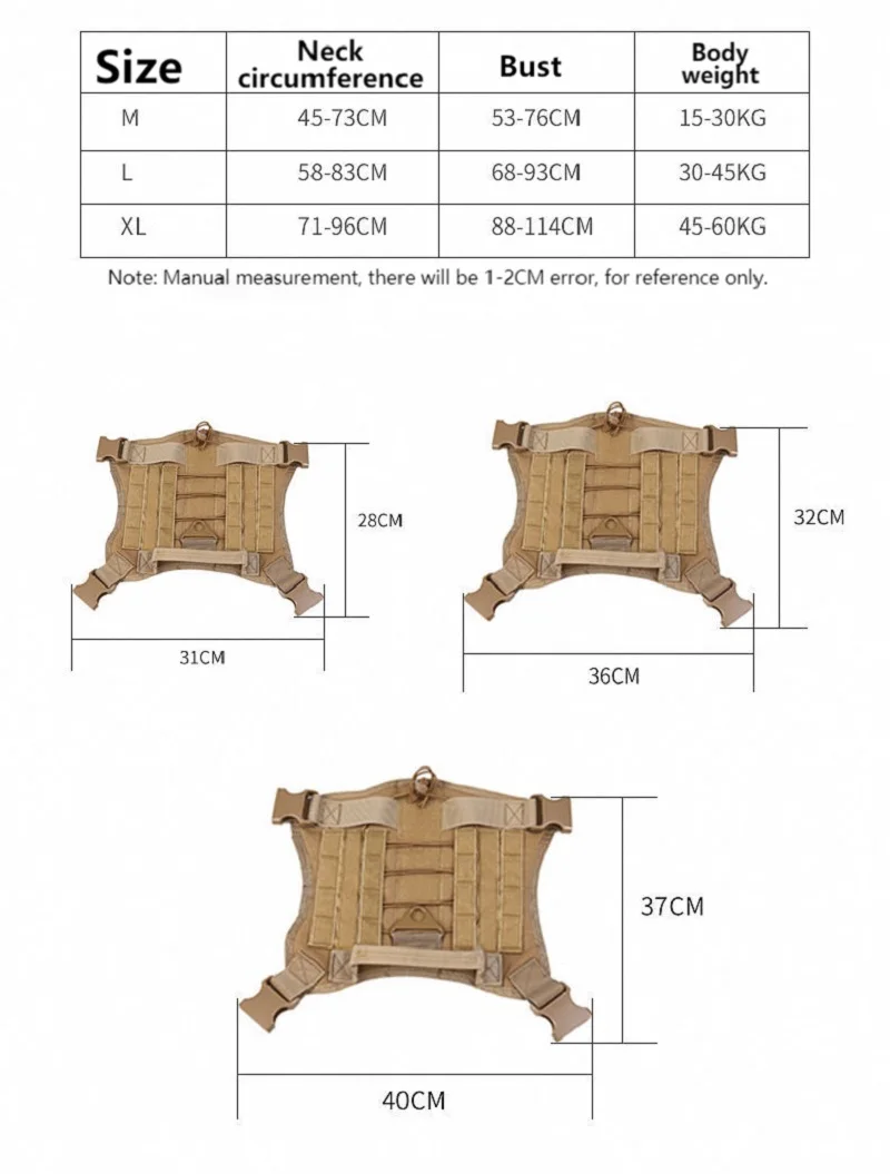 Название: Тактический Костюм с жилетом Цвет: камуфляж, черный, армейский зеленый, хаки Размер лямок: М: Шея: 48-73 см; Грудь: 53-76 см подходит для домашних животных Вес: 15-30 кг L: Шея: 61-86 см; Грудь: 68-93 см подходит для домашних животных Вес: 30-45 кг XL: Шея: 71-96 см; Грудь: 89-114 см подходит для домашних животных Вес: 45-60 кг Прочный материал и мягкая подкладка: Изготовлен из высококачественного нейлона 1000D и хорошо проложен во всех областях давления для удобной посадки. Легкий регулируемый поводок для собак: 4 быстросъемные пряжки для удобства надевания и выключения, обеспечивая дополнительную безопасность; С одной верхней ручкой для свинца и управления вашей собаки и одним v-образным кольцом на передней части для крепления собачьего поводка. Система MOLLE: каждая сторона оснащена двумя ремнями MOLLE, а также панелью hoop & loop strips, чтобы легко прикрепить Молле или ID-панели. Доступно в 4 цветах и 3 размерах: измерьте обхват груди вашей собаки, чтобы подобрать подходящий размер. (Таблица размеров приведена на рисунке) Теплый наконечник: -Размеры могут отличаться на 1-3 см при ручном измерении. -Для цвета, из-за различных мониторов и условий освещения, цвета могут немного отличаться от приведенных фотографий, пожалуйста, обратите внимание, спасибо.