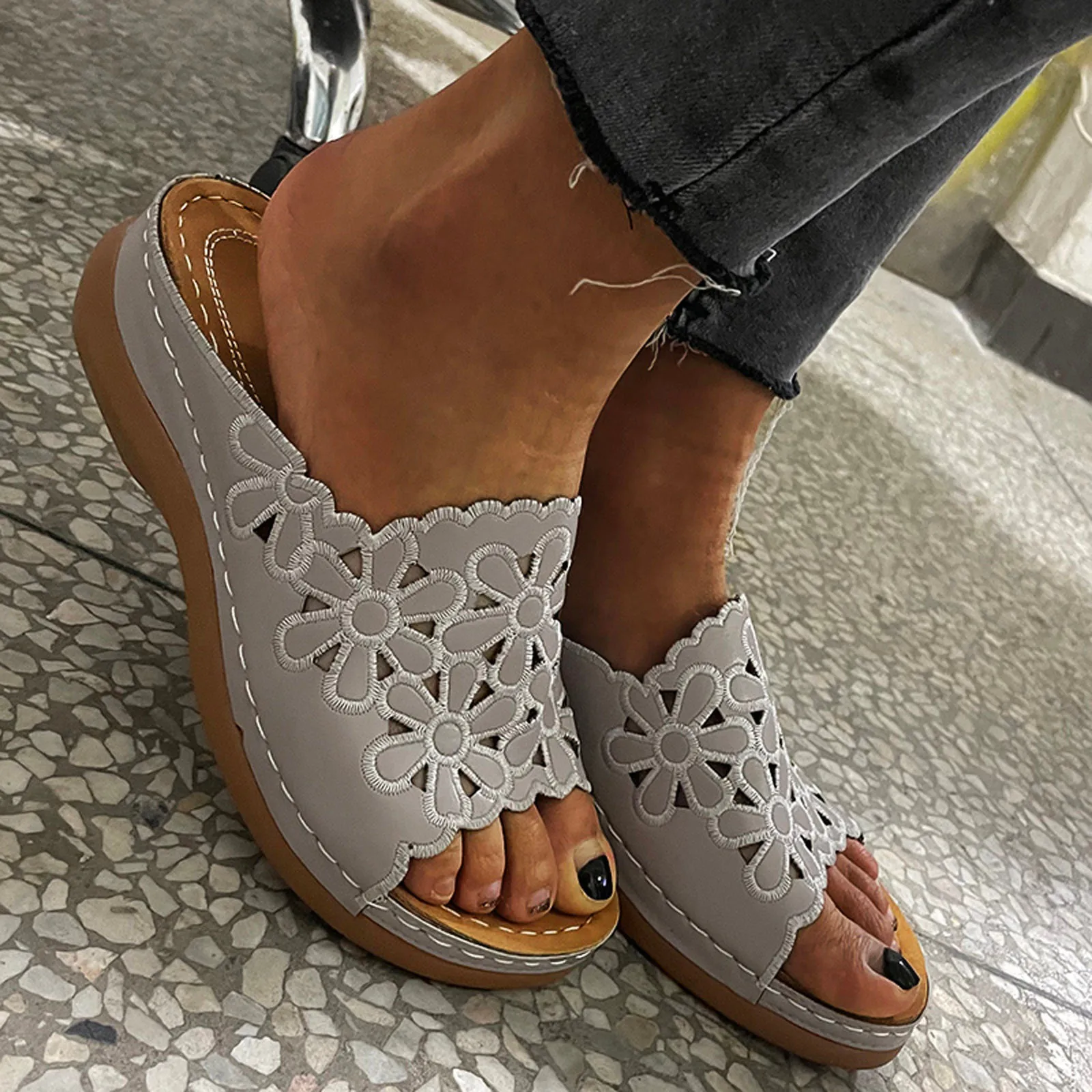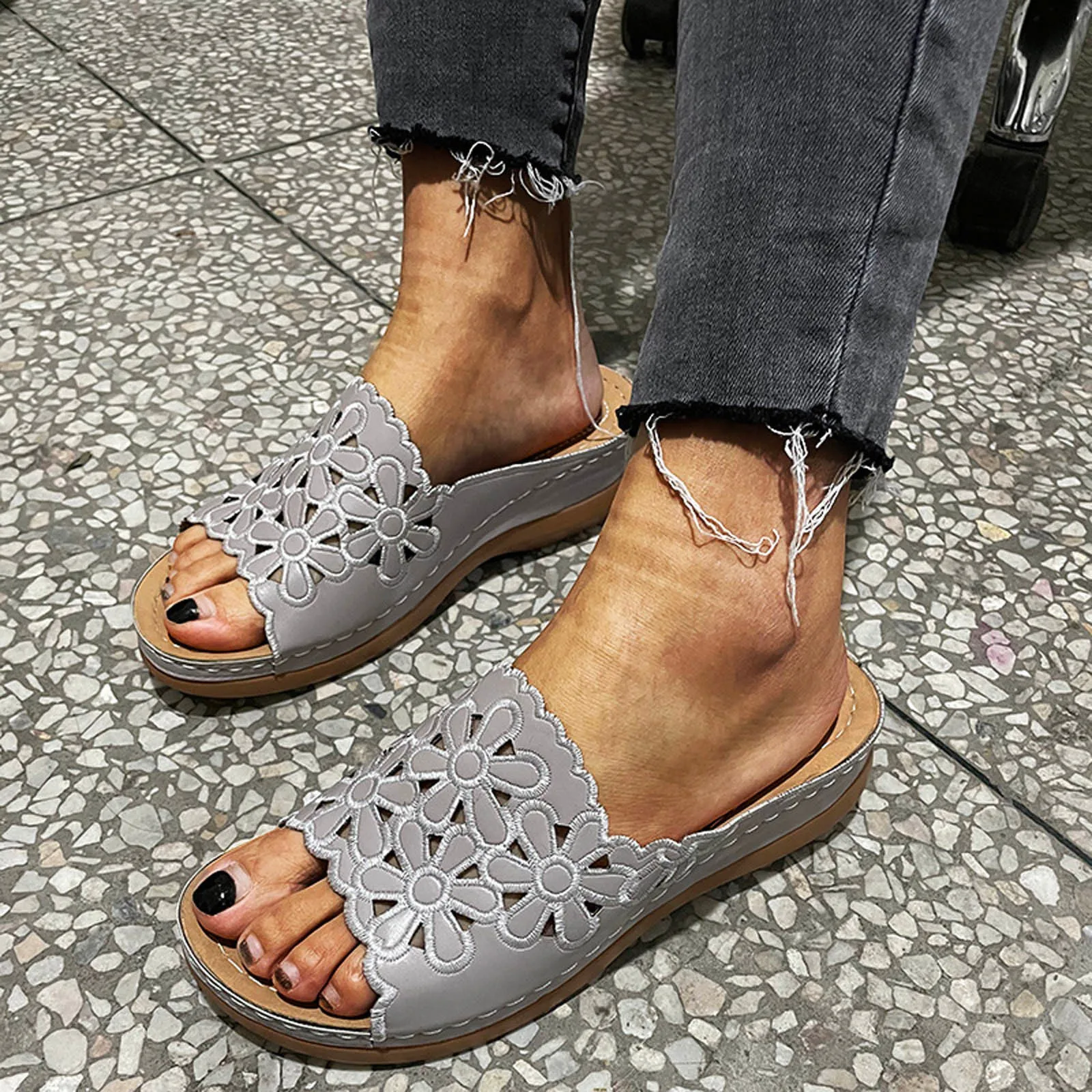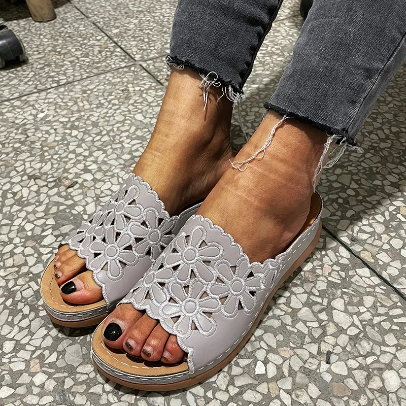 Летние женские повседневные модные сандалии с вырезами и цветами хризантемы
