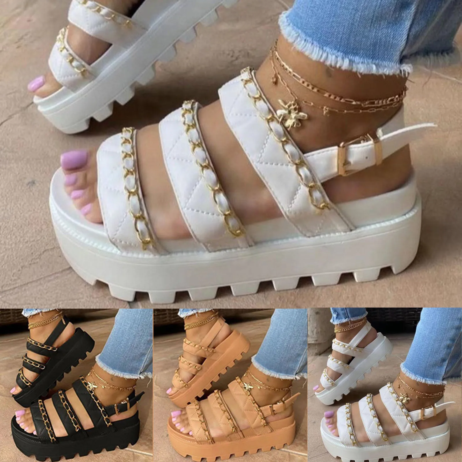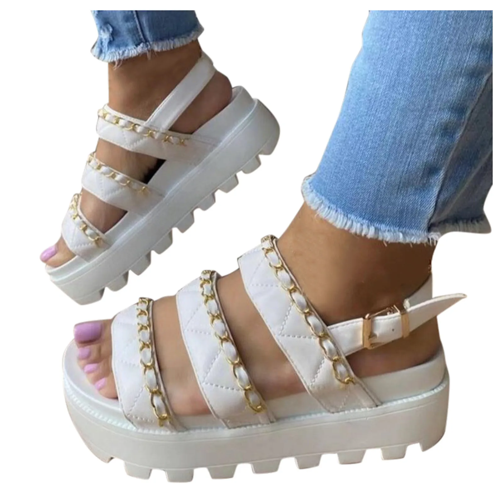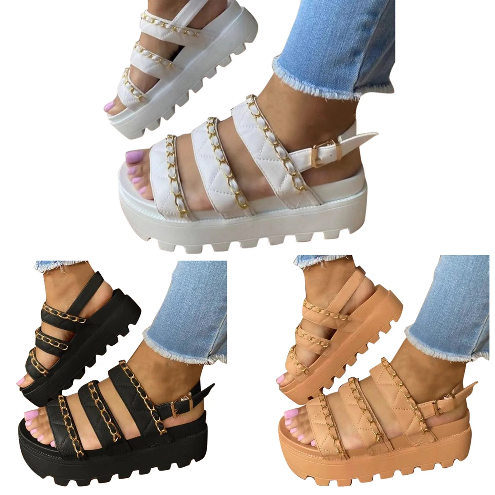 Женские модные однотонные сандалии с открытым носком на платформе с металлической цепочкой