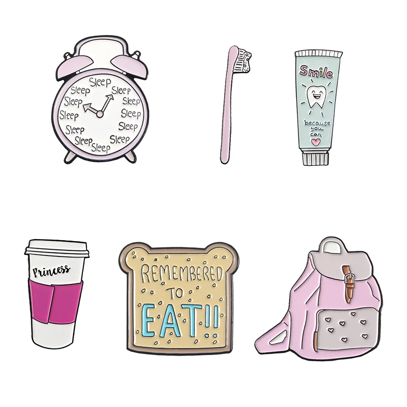 Брошь на лацкан детская утренняя эмалированная, с часами, кисточкой, кофе, рюкзак с изображением хлеба