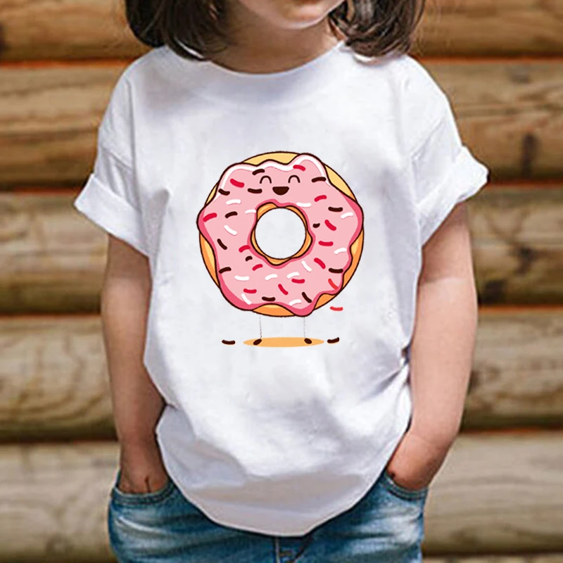 Летняя футболка с графическим рисунком для мальчиков и девочек, белая футболка с принтом пончиков, Новая повседневная детская одежда, однотонная Короткая свободная футболка Seelvess