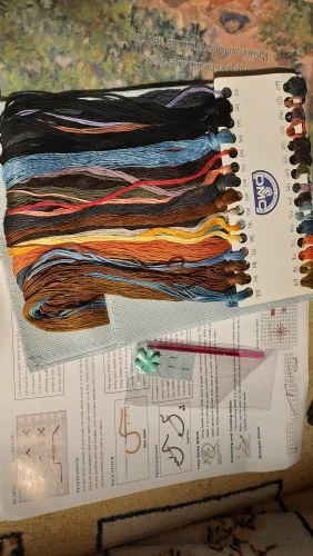 заказ пришёл за 2 недели. как всегда всё отлично. внимательный продавец и очень ответственный. заказываю не первый раз. попросила заменить канву на серо-голубую. такая и пришла в наборе. хотела как в оригинале у Мережки. там 16 каунт и серо-голубая канва. нитки dmc разложены на органайзере. схема цветная.