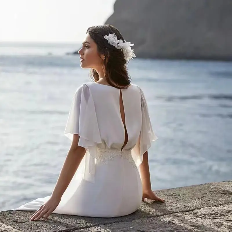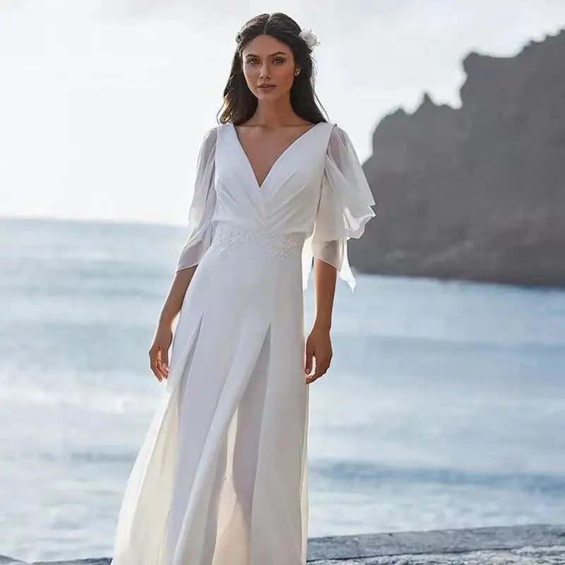 Высокая Разделение, v-образный вырез на шее, шифоновое свадебное платье 2021 с низким вырезом на спине кружевное пляжное размера плюс свадебные Сатиновые туфли в стиле Бохо Замочная скважина свадебное платье