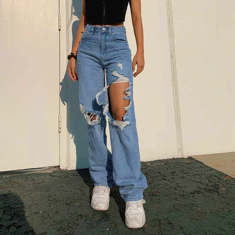Модные женские рваные мешковатые джинсы винтажные с высокой талией в стиле 90-х эстетичная одежда для мам y2k джинсовая уличная одежда 2021 весенние женские прямые брюки