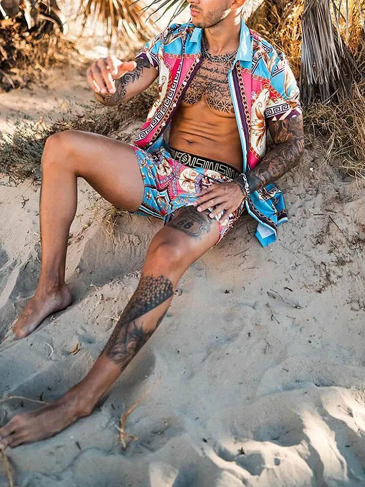 Мужская рубашка с коротким рукавом и принтом, пляжные шорты с лацка...