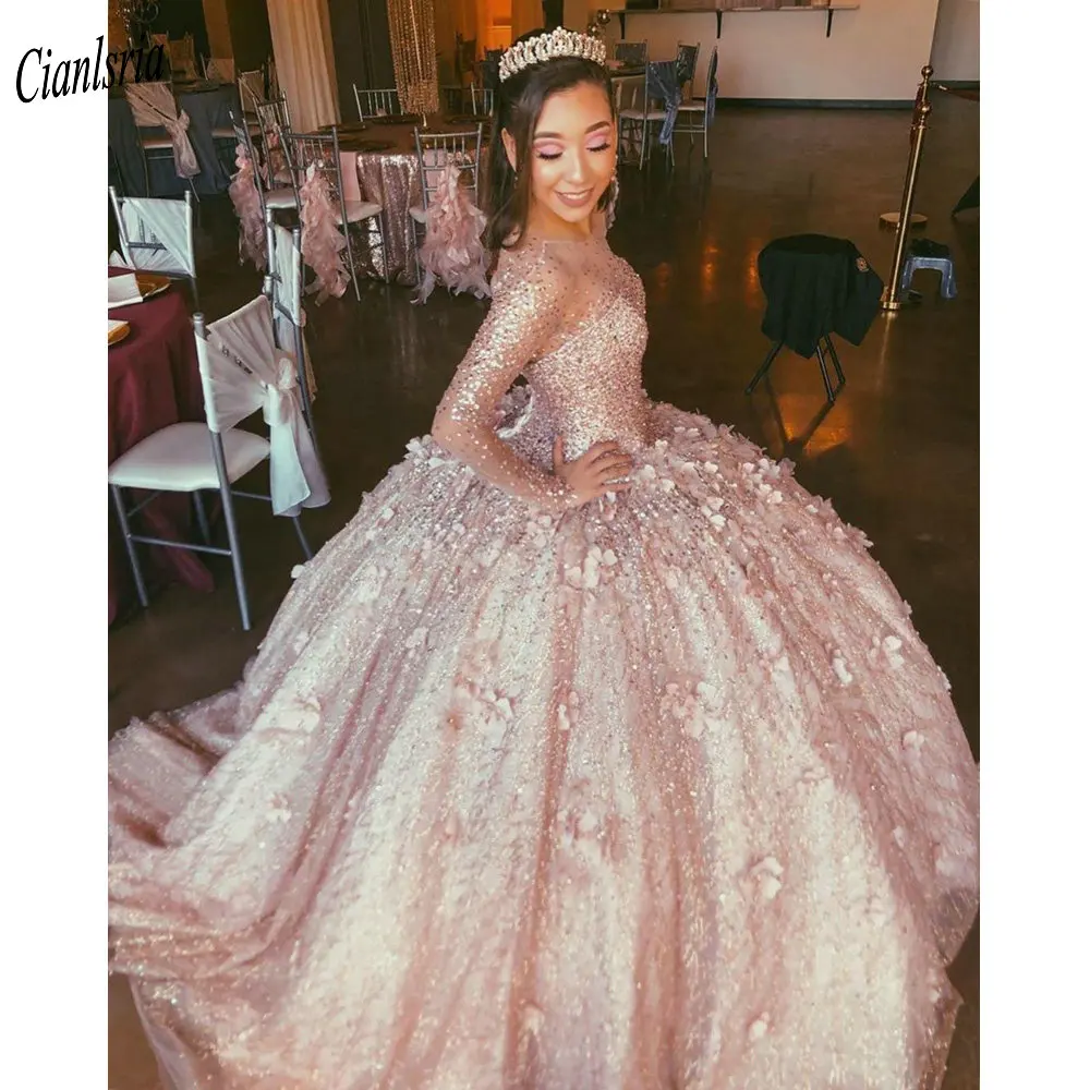 Румяна розовые 3D цветочные платья Quinceanera 2021 блестящие тюлев...