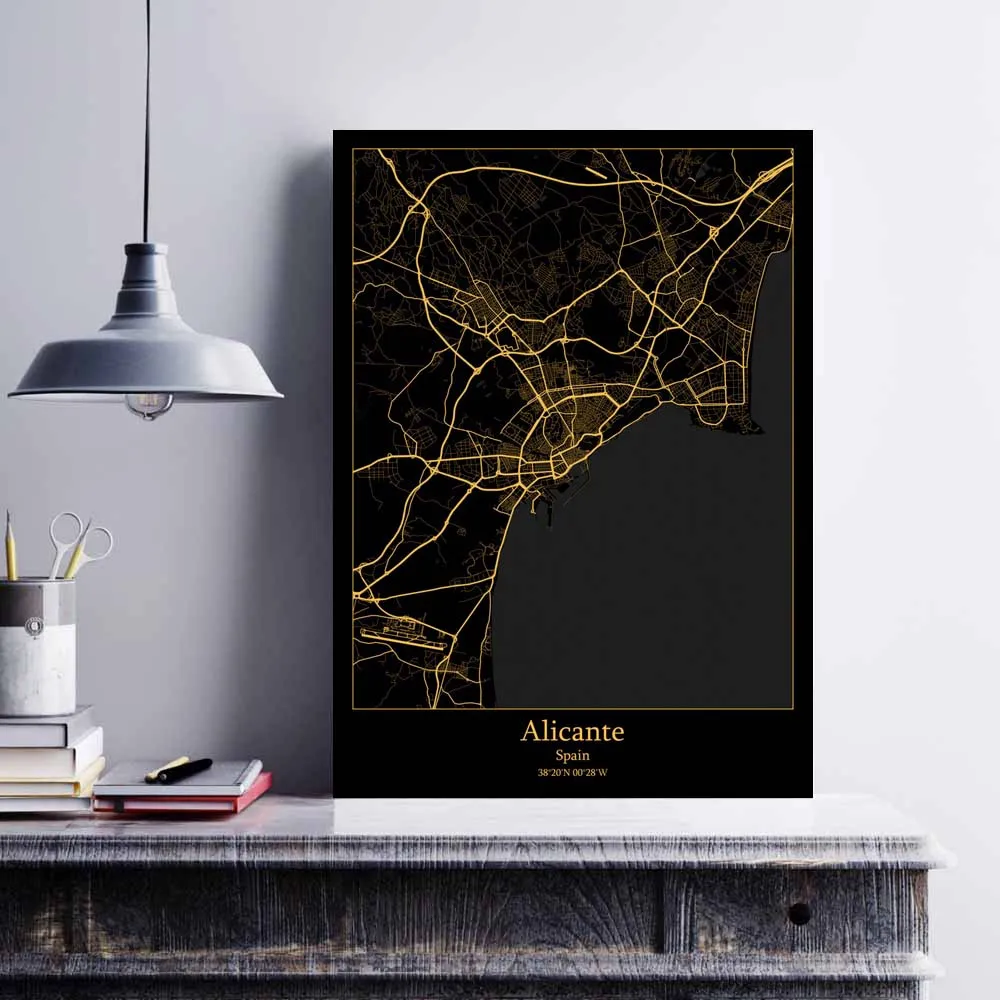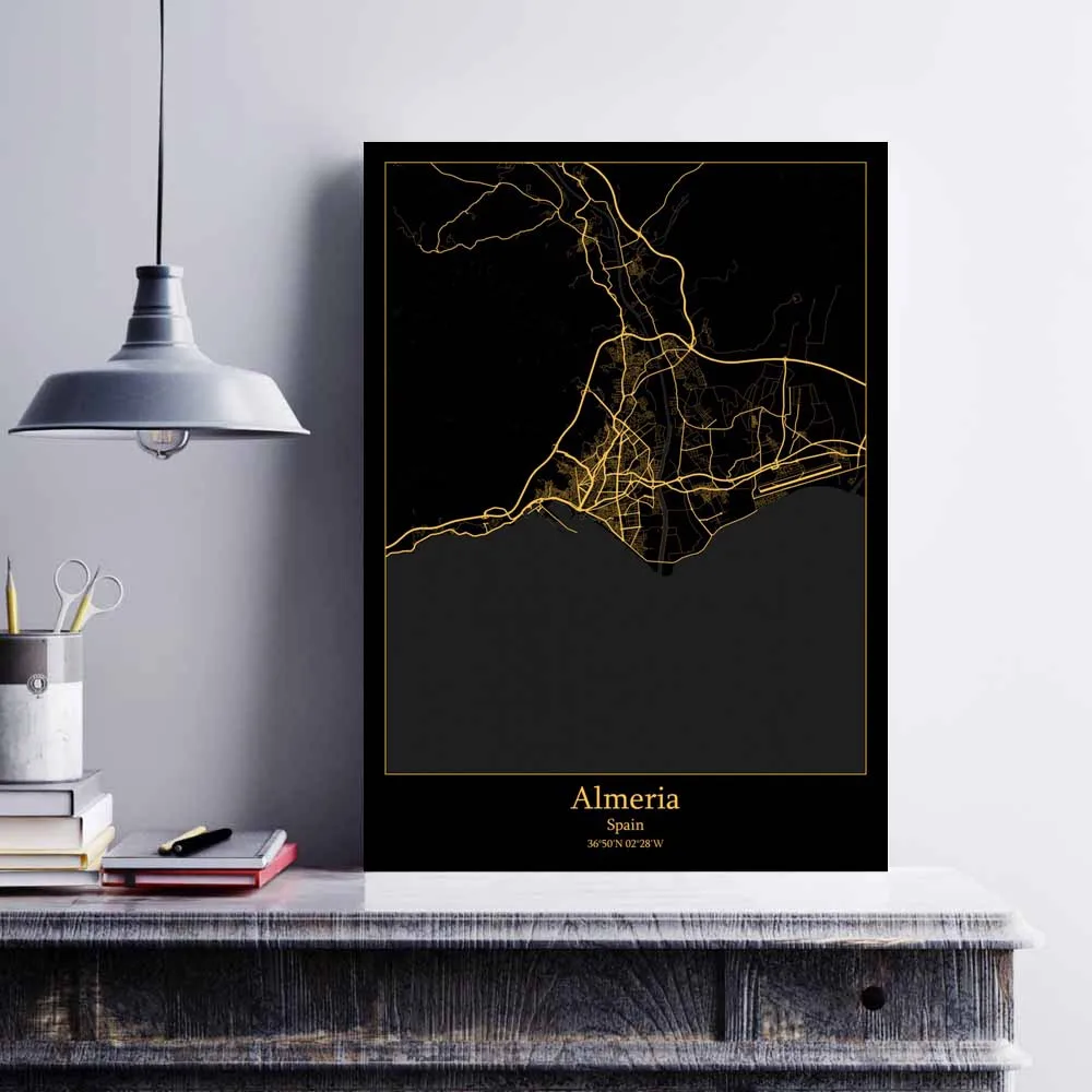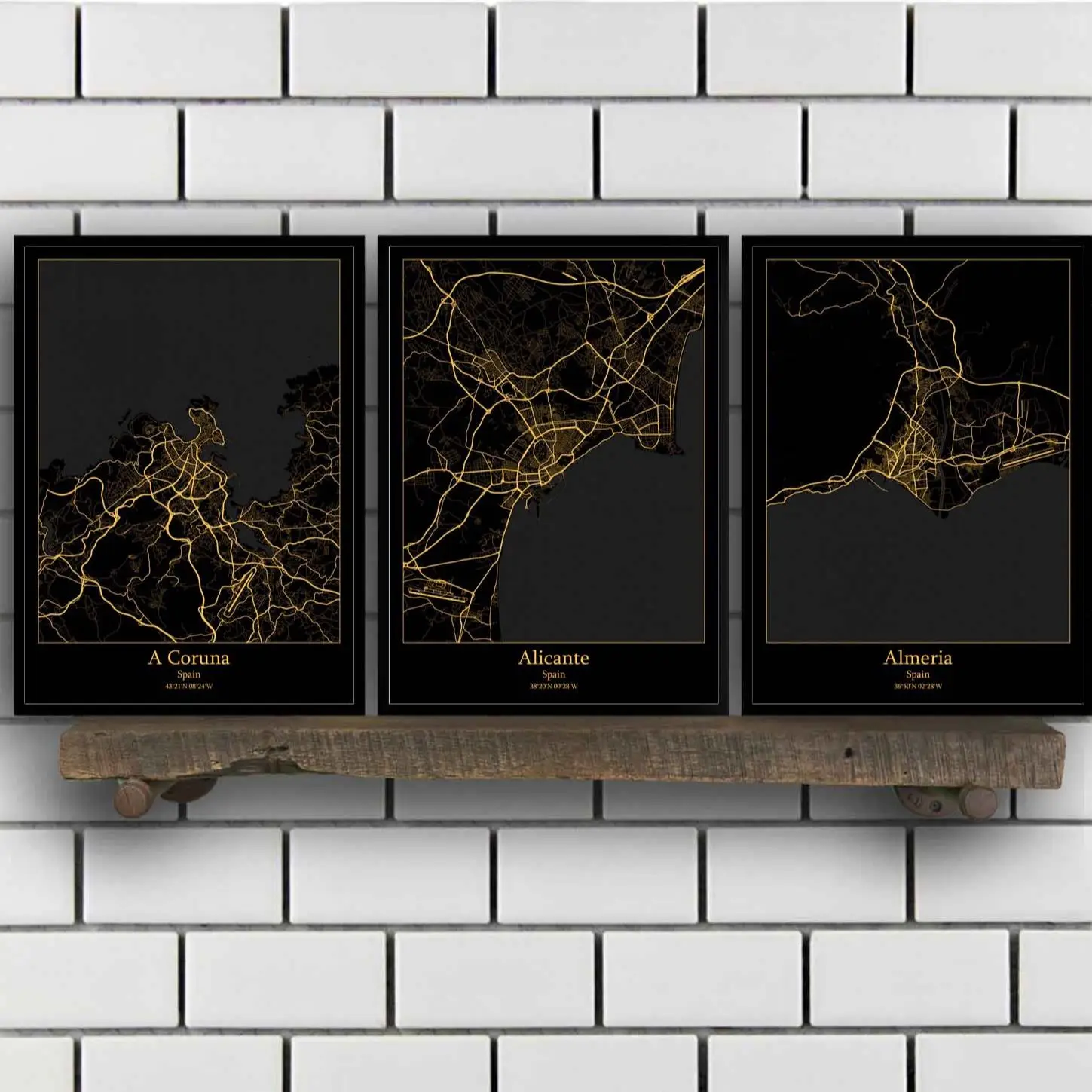 Плакат A Coruna Alicante Almeria Badajoz, Барселона, Бильбао, гиджон гирона, Гранада, хуелва, Леон, Мадрид, Малага, карта Испании