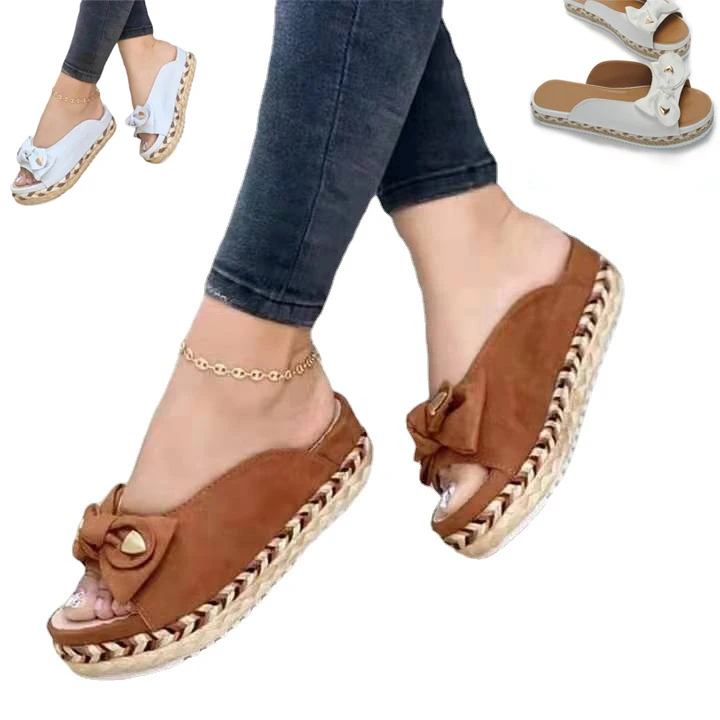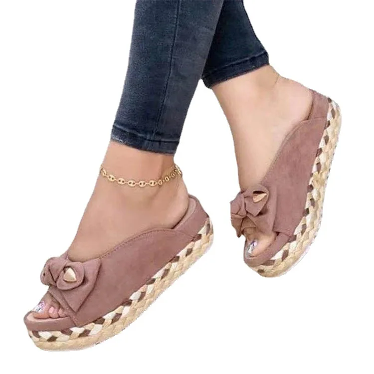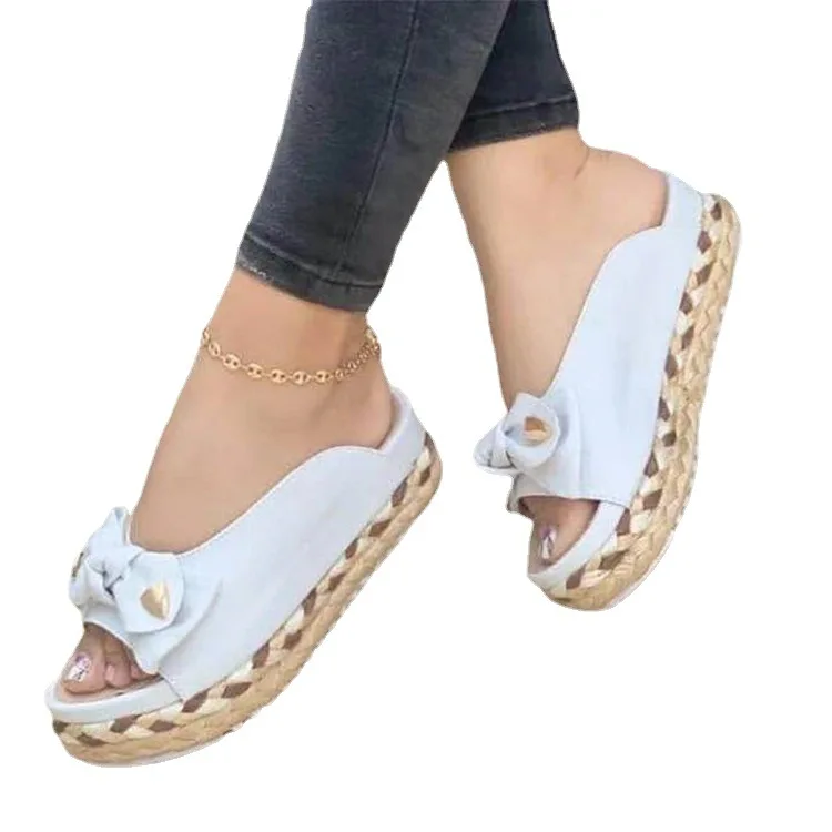 Тапочки; Сандалии; Модные соломенные туфли на плоской платформе с бантом из ротанга; Женские тапочки размера плюс; Chaussures Femme