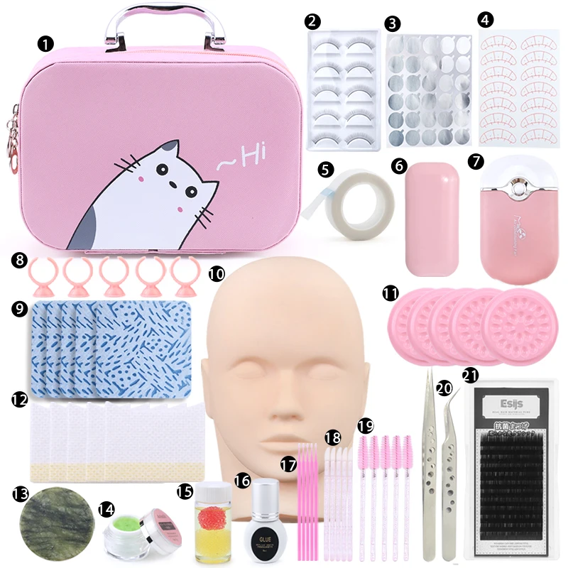 [1] 1 шт. * розовая косметичка премиум класса[2] 5 пар * тренировка накладных ресниц[3] 1 шт. * Серебряный Клей стикер[4] 1 шт. * стикер для глаз[5] 1 шт. * Нетканая лента 9 м[6] 1 шт. * розовая наклейка на лоб[7] 1 шт. * 1 шт. * розовый вентилятор[8] 5 шт. * клеевое кольцо[9] 5 шт. * Безворсовая бумага[10] 1 шт. * голова-манекен для практики[11] 5 шт. * клеевая прокладка[12] 5 шт. * нетканый пластырь для глаз[13] 1 шт. * Клей[14] 1 шт. * 5 мл средство для удаления ресниц[15] 1 шт. * Пинцет для жидкого клея[16] 1 шт. * 8 мл клей для ресниц[17] 5 шт. * микро кисть[18] 5 шт. * кисть для губ[19] 5 шт. * Кисть для ресниц[20] 1 пара * Пинцет высокого качества[21] 1 шт. * ресницы (стиль ресниц отправляется случайным образом)