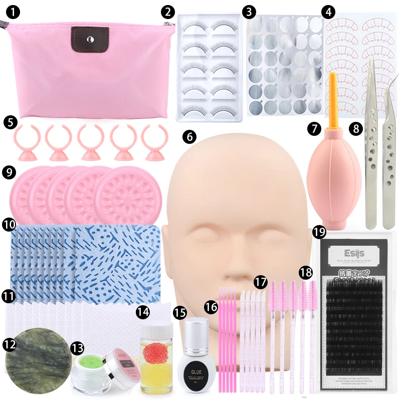 [1] 1 шт. * розовая косметичка[2] 5 пар * тренировка накладных ресниц[3] 1 шт. * Серебряный Клей стикер[4] 1 шт. * стикер для глаз[5] 5 шт. * клеевое кольцо[6] 1 шт. * голова-манекен для практики[7] 1 шт. * ресницы[8] 1 пара * Пинцет высокого качества[9] 5 шт. * клеевая прокладка[10]10 шт. * Безворсовая бумага[11] 10 шт. * нетканый пластырь для глаз[12] 1 шт. * Клей[13] 1 шт. * 5 мл средство для удаления ресниц[14] 1 шт. * Пинцет для жидкого клея[15] 1 шт. * 8 мл клей для ресниц[16] 5 шт. * микро кисть[17] 5 шт. * кисть для губ[18] 5 шт. * Кисть для ресниц[19] 1 шт. * ресницы (стиль ресниц отправляется случайным образом)
