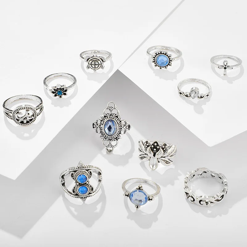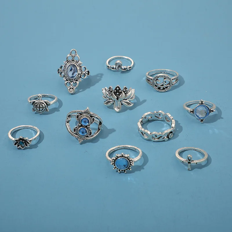 Старинные антикварные Щепка Цвет лотоса черепаха костяшки Миди кольцо комплект ювелирных изделий для женщин синий Стразы геометрической формы кольца ювелирные изделия Anillos